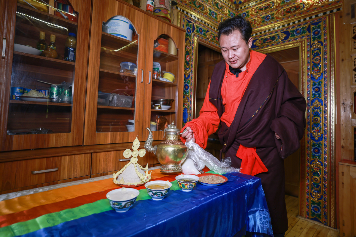 “这些酥油花和青稞是准备‘抢头水’用的。”让布介绍,“抢头水”是当地除夕夜的重头戏。