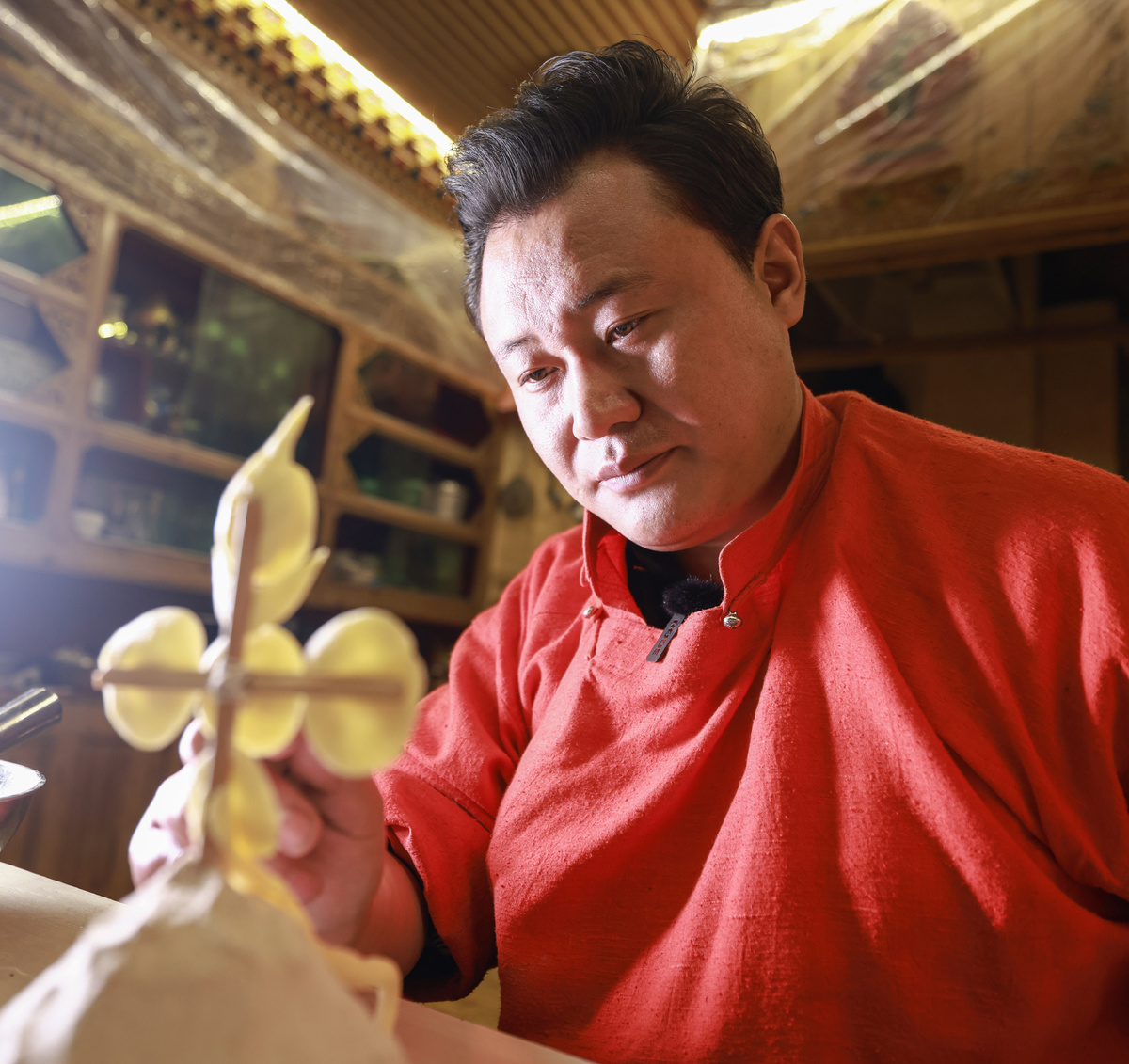 如此的动作反复许久,面前摆放着的十余种酥油胚料一点点减少。日、月、星等图案也“绽放”在一块木板上。当小木板插入事先堆好的糌粑里,寓意吉祥的酥油花便完成了。
