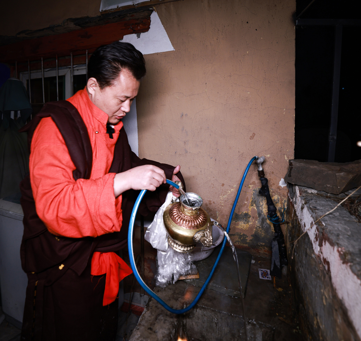 据让布介绍,“抢头水”时需要有“抢”的人,还要有“接”此“抢”的人。“按藏历历算习俗,今年迎接抢头水的人属虎是最好的,我刚好属虎。”谢让卓玛走拿着酥油花走在前面,大声喊着祈福语“扬柯雄”,寓意福运连连,而让布一手提起水桶,一手拿着海螺吹了起来。