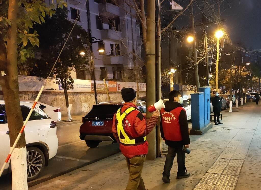 2月1日,大年初一,自贡市自流井区五星街高山井社区居民陈世全、刘大贵继续走街串巷,与社区工作人员一起进行疫情防控宣传、社区巡逻喇叭喊话,严格按照“网格化”管理要求,发放倡议书,宣传自贡市关于调整扩大禁止燃放烟花爆竹区域的通告等内容,及时把疫情防控知识、禁燃禁放要求以及安全用火用电知识传递到千家万户。