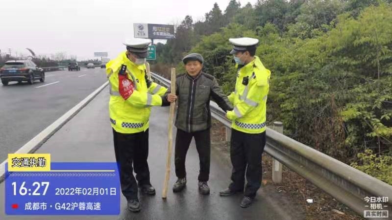 2月1日16时25分,民警严嘉、张雯带领辅警王凯正在路面巡逻的返程途中,在沪蓉高速离成都收费站还有2公里时,严嘉突然瞥见超车道上一位老人拄着拐杖在一瘸一拐的逆向行走。“快靠边停车,超车道有一个行人!”此时正下着雨,高速路面湿滑,该路段又处于下坡和弯道处,过往车辆车速很快,情况十分危险。