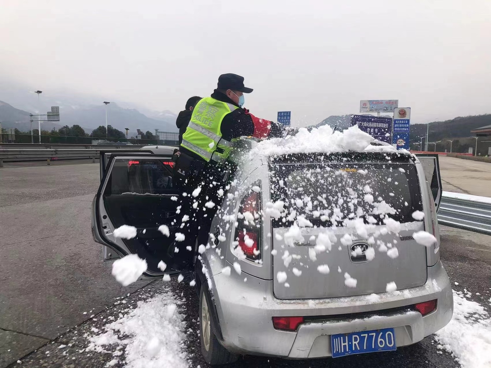 2月1日大年初一,四川高速公安二分局民警在中子服务区巡逻过程中,发现许多从广元曾家山旅游景区返程的车辆上,车顶多了一个人——“雪人”。