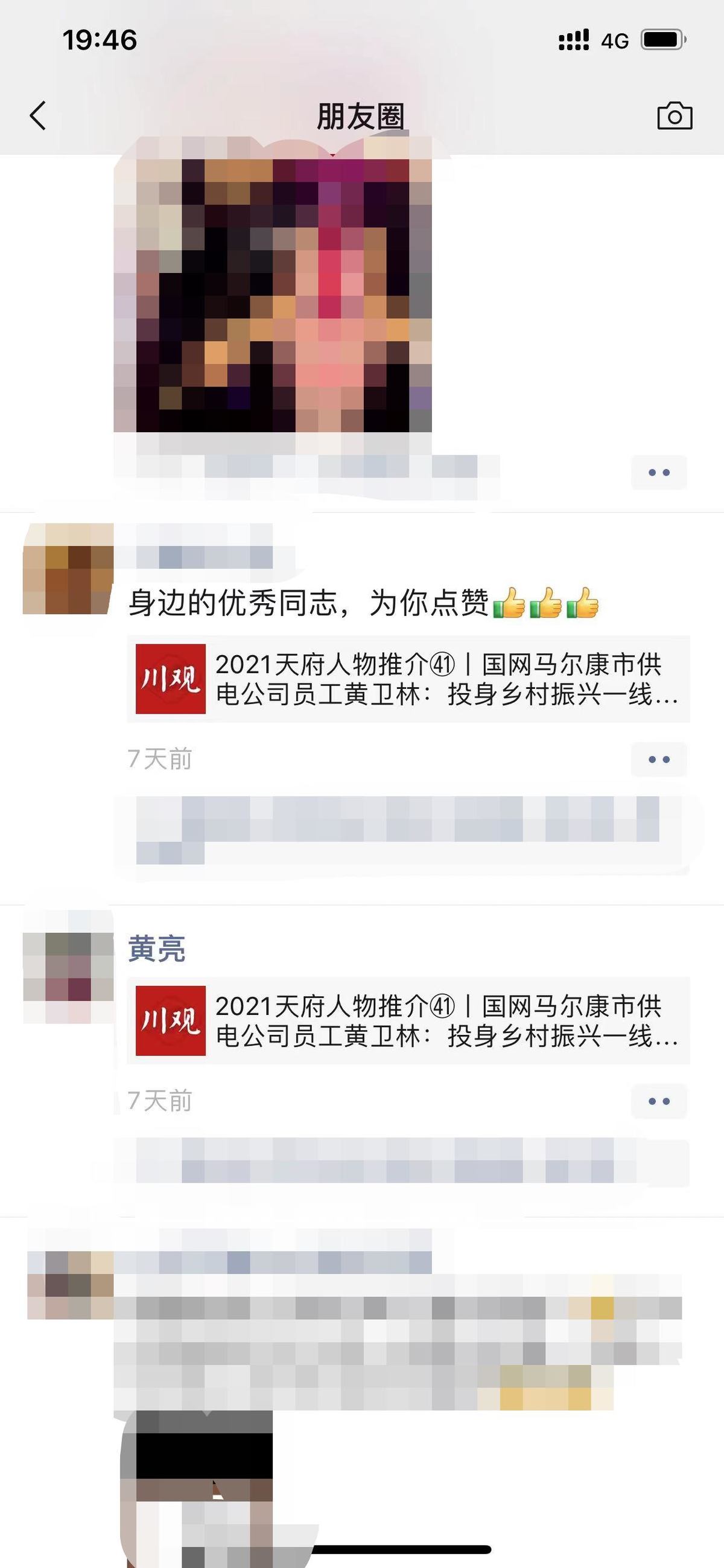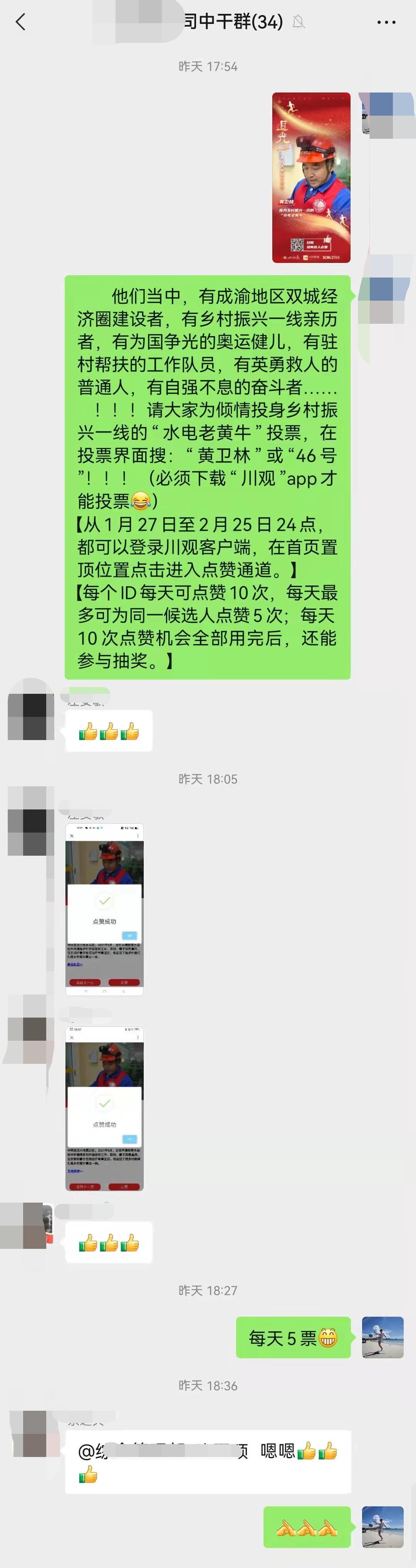 据了解,自1月27日收到组委会通知,告知“追光2021”天府人物推介进入在线点赞阶段后,国网马尔康市供电公司就在公司系统内外广泛发动职工为“水电老黄牛”黄卫林点赞,一时间,微信群、QQ群、办公室里都热闹了起来,大家都晒出了为黄卫林点赞的截图。同时,公司也号召全体职工在自己身边亲朋好友圈里为他点赞。