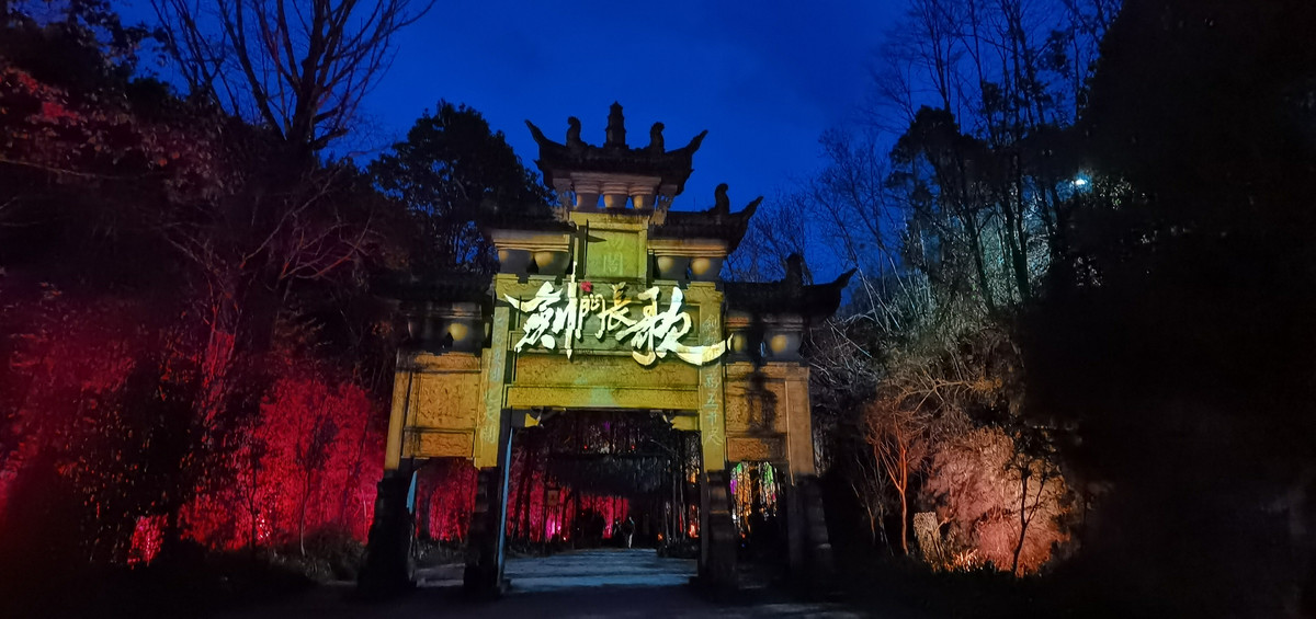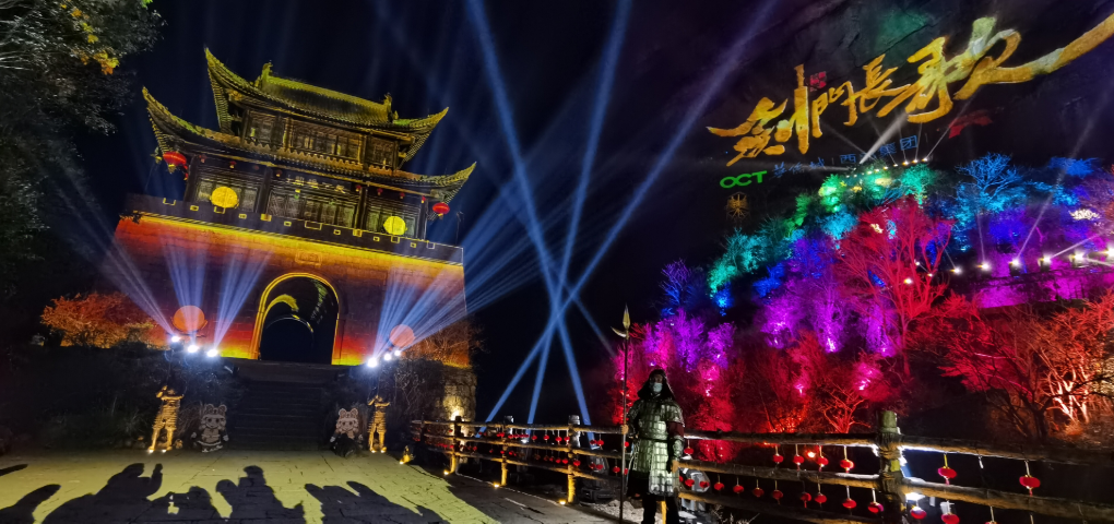 《剑门长歌》是全国首个崖壁灯光演艺秀、全国首个行进式通关夜游灯光秀。以穿越剑门蜀道千年浩瀚历史为主线,利用千年蜀道的雄奇天险,以10000平方米天然崖壁为幕、星空为景,通过深入挖掘蜀道、三国、诗词、民俗等历史文化和地域文化,充分利用牌坊、关楼、崖壁、浮雕墙、树木等载体,融合全息投影、灯光秀演、真人演艺、声光互动等形式,让游客在两个多小时内穿越2400年的剑门蜀道风云沉浮,沉浸式体验历史盛景。