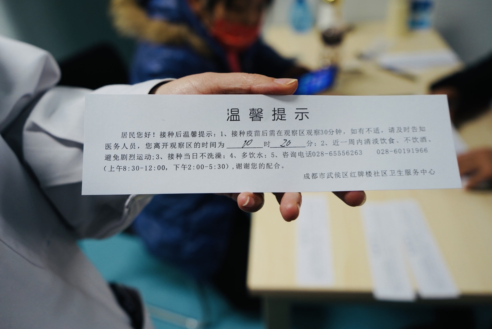 便民服务和温馨提示在接种区内无处不在。如在登记区,一大一小两台打印机专门为居民提供免费打印服务。“打印机分别是武侯区疾控统一配备及租借的,用于打印成年人接种凭证、儿童预防接种证。”董婷介绍。在留观区,接种点还专门设有“棉签提示板”,提醒居民棉签要按压一分钟、投入黄色医疗垃圾桶、禁止带入留观区等,另外还贴有温馨提示,提醒居民“新冠疫苗接种24小时内不能检测核酸,以免影响检测结果”等。
