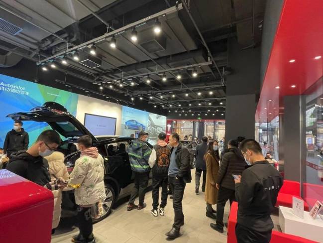 春节期间,看车的市民川流不息。(特斯拉成都太古里体验店供图)