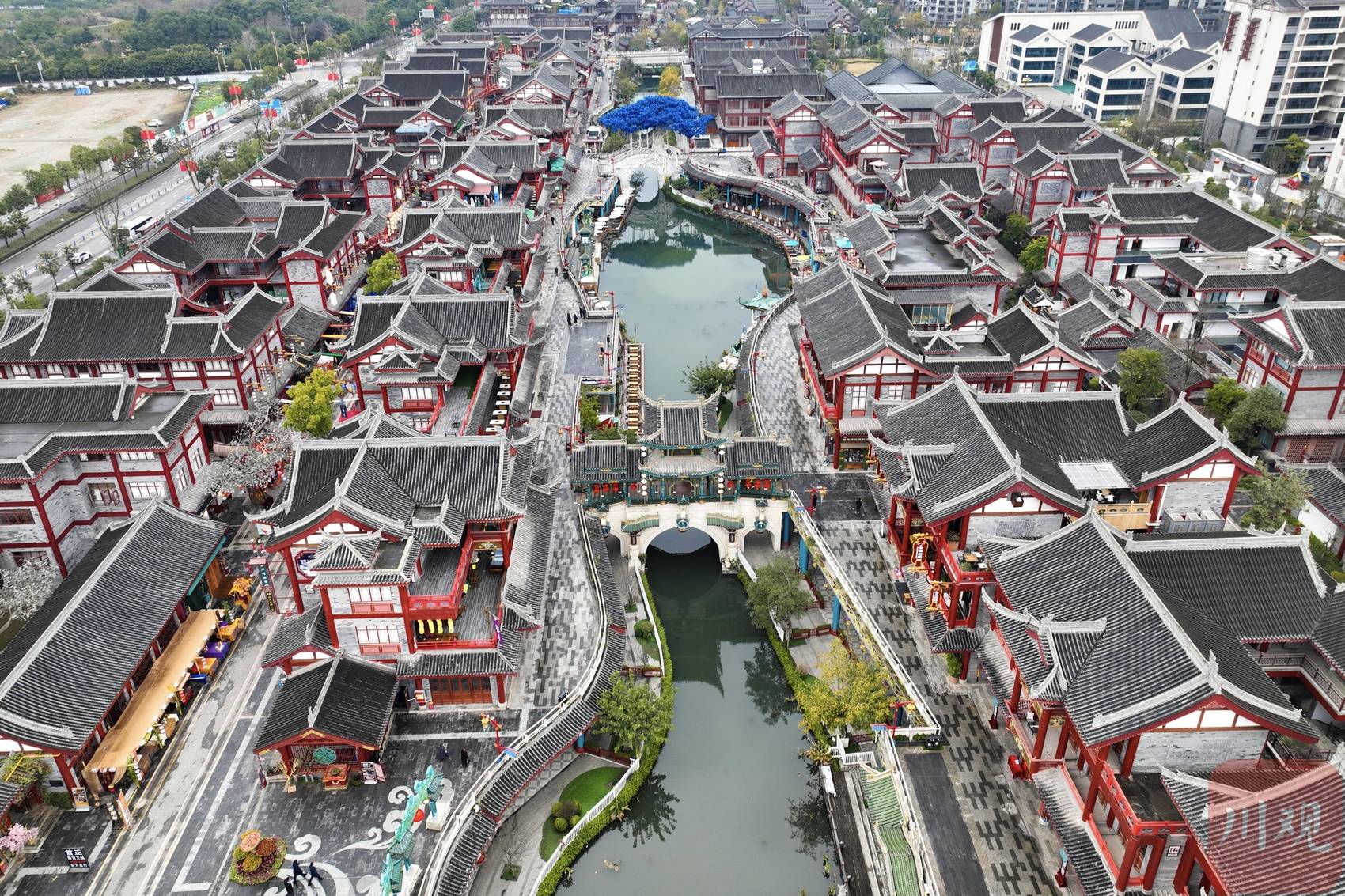 去年5月,眉山市东坡区“穿越盛世水街”凭借宋代风格的仿古建筑和充满沉浸式体验的夜间灯光场景营造,一开街便走红,成为四川乃至全国最火的文旅项目之一,被网友称为“大宋不夜城” 。2022年春节,水街再次迎来客流高峰,接待游客近30万人次,远超不少省内热门景点。“大宋不夜城”白天长什么样?2月7日,记者通过无人机航拍,带你看这一片壮观的仿古建筑群。