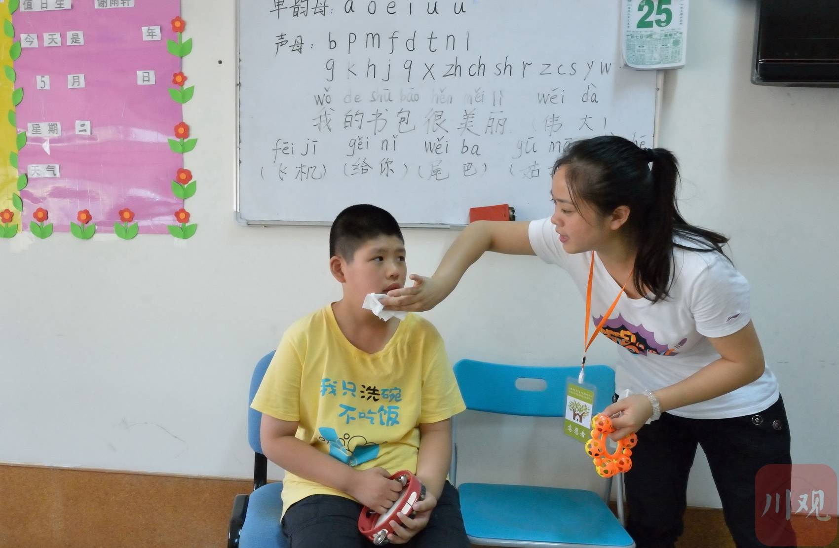 地震灾区的人更懂感恩,张国先利用课余时间到福利院做义工,帮助残疾儿童。