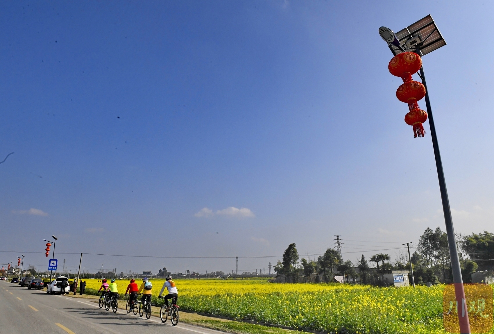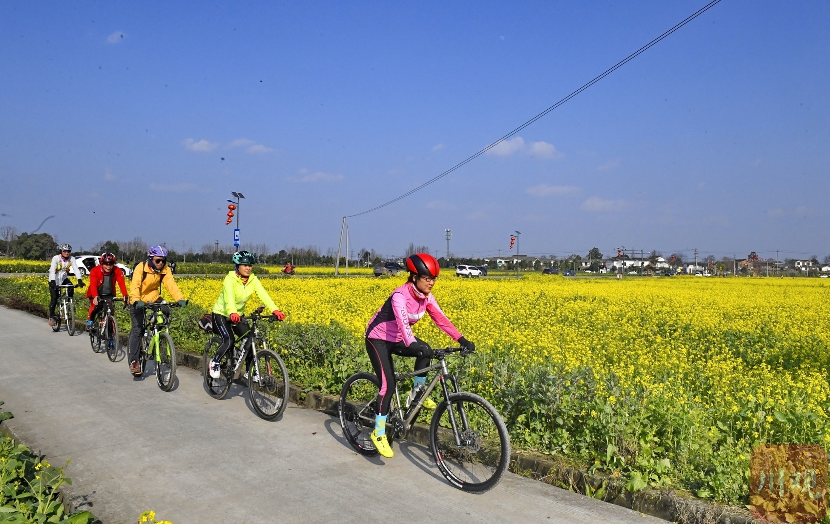 2月11日,四川省崇州市白头镇境内油菜花争相开放,游客在花海中骑行,感受春天的气息。