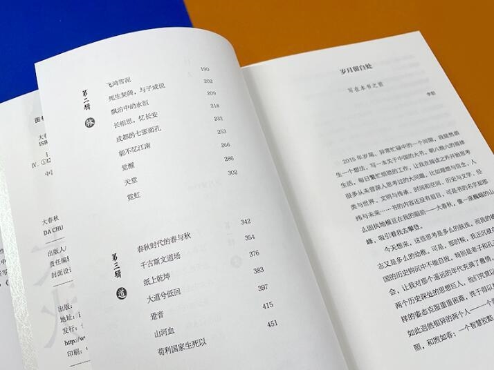 《大春秋》分“士”“脉”“道”3辑共23篇,不仅收录了作者具有代表性的散文名篇,如《江春入旧年》《飘泊中的永恒》《春秋时代的春与秋》等,还收录了其最新写作的散文佳篇,如《千秋一扬雄》《霓虹》《觉醒》《跫音》《山河血》等,每一篇都以一首诗词作为开篇。因为每篇文章都是围绕一个历史人物或者一个历史故事展开的,所以选择的诗词也都与之对应的内容相关联,由此作为给读者的阅读提示。在作者一次次思想的碰撞中展现中国文化的纵横捭阖、博大精深。