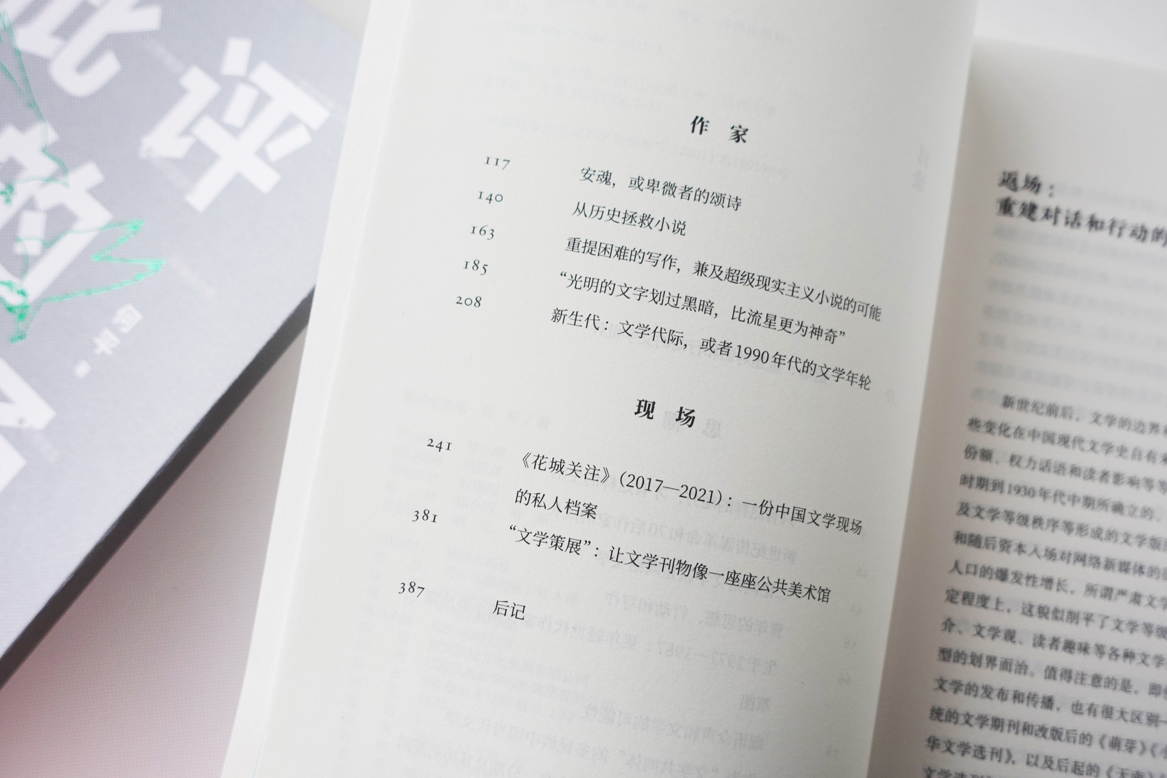 全书分为“思潮”、“作家”与“现场”三辑。据何平介绍,“思潮”,是对改革开放时代,尤其是新世纪二十年中国文学整体的勘探和思考,涉及改革开放时代中国文学整体观、世界性和地方性、文学和代际、文学和媒介、青年写作和公共生活、多民族文学和文学共同体等话题。