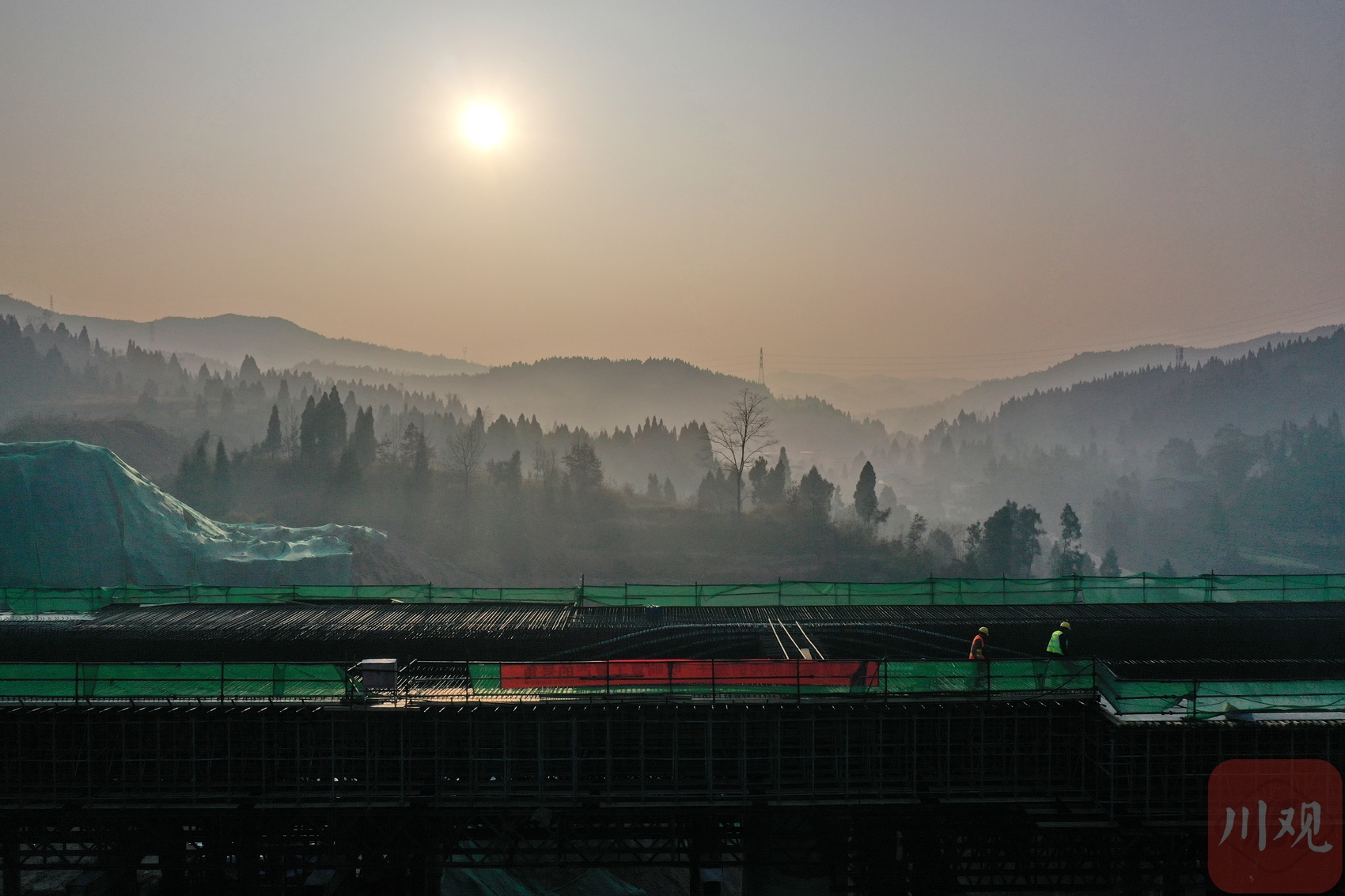 2月15日,四川省南充市仪陇县新政镇的汉巴南铁路仪陇段的巴岩店特大桥施工现场周围薄雾缭绕,一排排桥墩墩柱林立,与远处高低起伏的山脉相拥而立,在阳光下熠熠生辉。