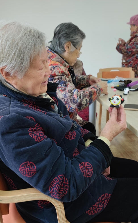在社工帮助下,老人们拿起粘土揉搓、切块、定型,甚至在冰墩墩的原型上加上自己的一些润色。谈笑间,就也各自完成了作品。