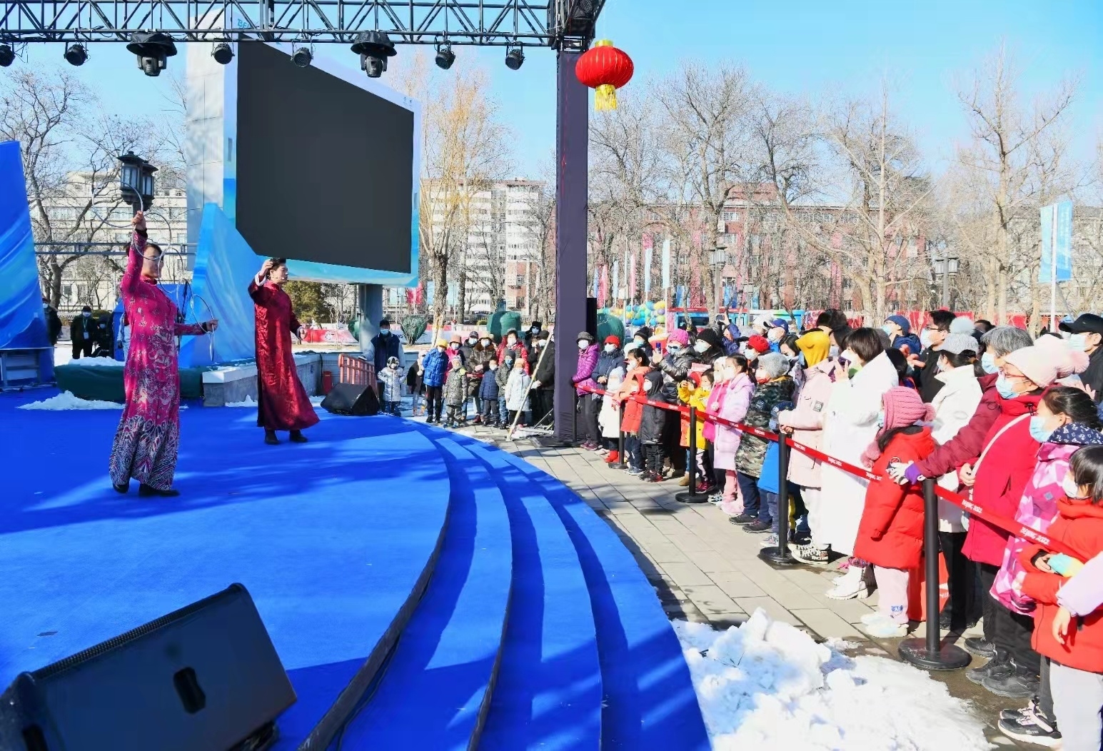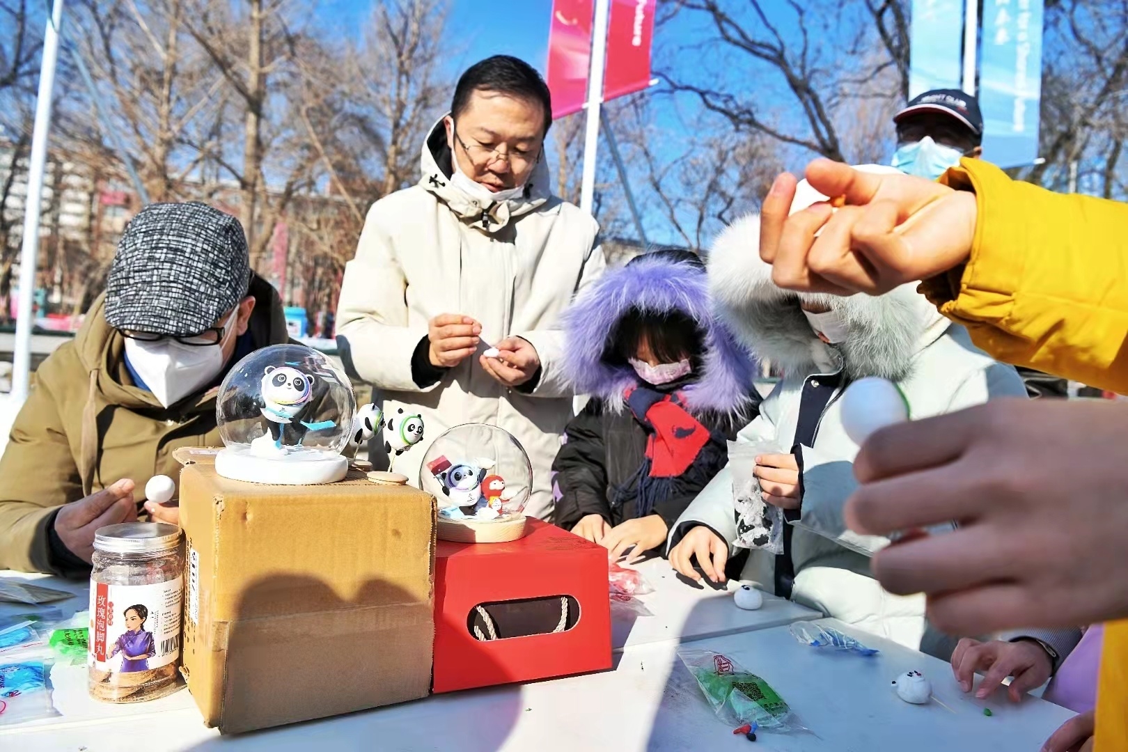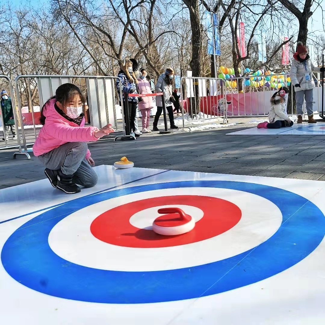 广场为游客提供了2条冰壶赛道、2条冰蹴球赛道,市民可组队参与体验,还有志愿者对冰雪项目进行规则讲解和辅导。
