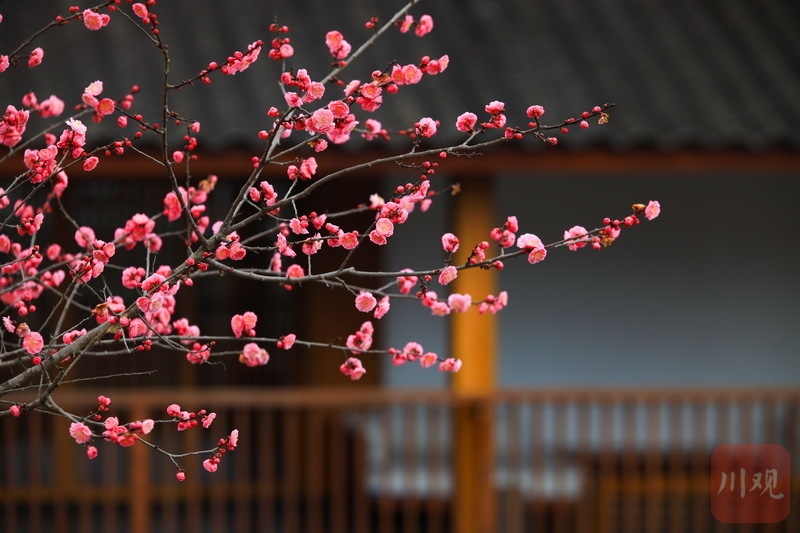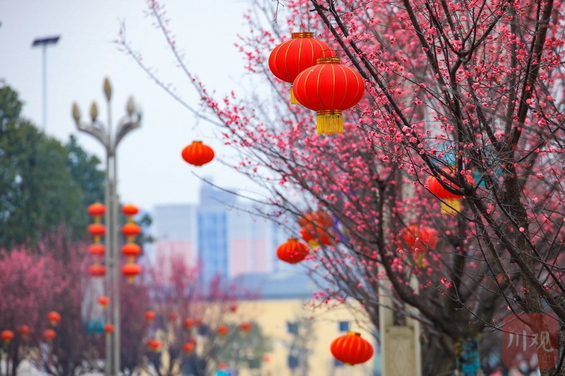 2月16日,在雅安名山区“十里梅香·茶源小圳”内外,一排排、一簇簇红梅迎春绽放,绯红一片,散发阵阵幽香,与喜庆的大红灯笼、别致的民居等相映成辉,呈现出一派春意盎然的景象,成为不少市民踏春赏花的好去处。