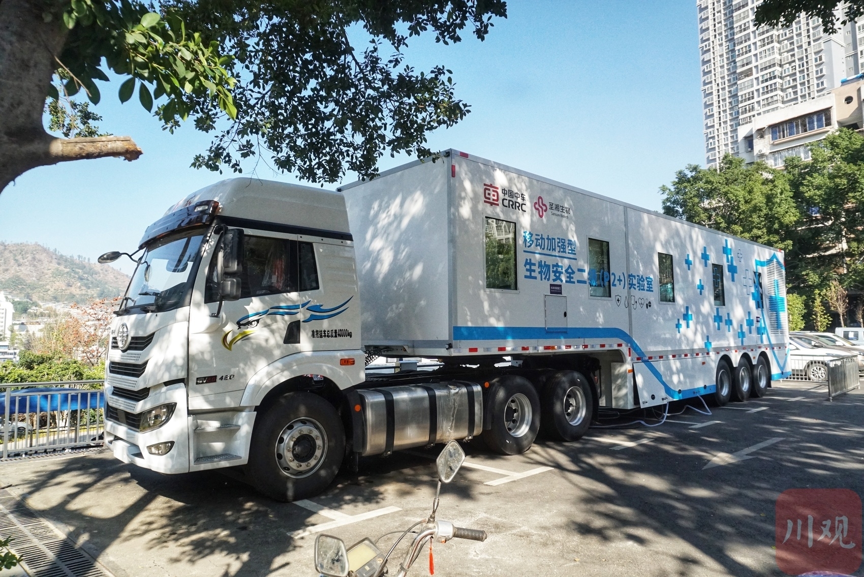 一汽牵引车头,车厢通体白色,上贴蓝色标识,2月18日,记者在攀枝花市中心医院内见到了攀枝花市首个新冠核酸检测移动方舱实验室。该实验室由省卫生健康委配置,2月14日完成相关设备的安装调试,已完成实际检测6000余人次。