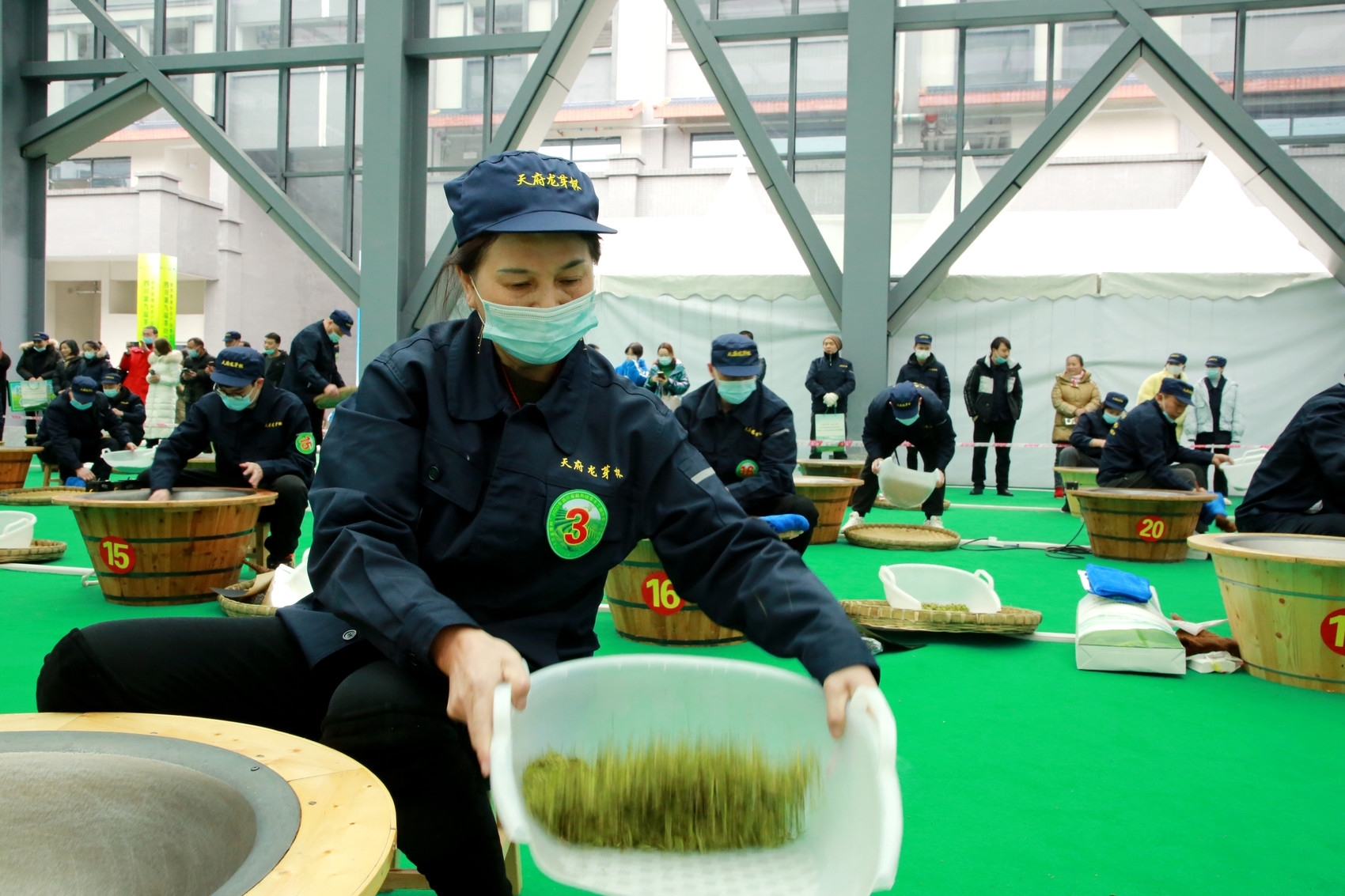 竞赛采取现场技能操作考核的形式,包括理论知识考试、现场技能操作和成品茶质量评审三部分。按单芽头标准,现场为每位参赛者提供400克茶树鲜叶,经过摊放、杀青、做型等手工炒制后,专家评审组根据茶叶的外形、汤色、香气、滋味等多方面进行评分,分别评出一等奖1名,二等奖2名,三等奖17名。