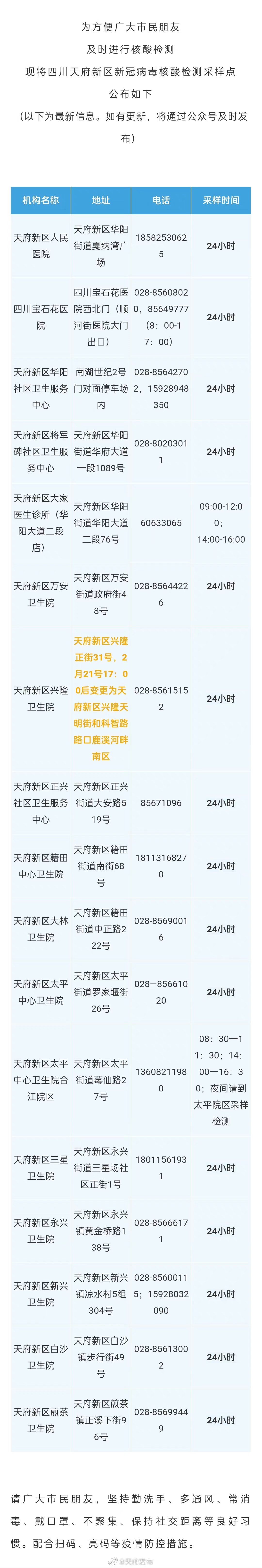 据四川天府新区管理委员会官方微博消息,为方便广大市民朋友及时进行核酸检测,现将四川天府新区新冠病毒核酸检测采样点进行公布。