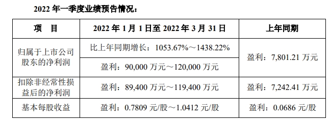 相比之下,2022年一季度的盈利能力更为惊人。根据2022年一季度业绩预告显示,公司可实现利润9亿元到12亿元,同比增长1053.67%到1438.22%。