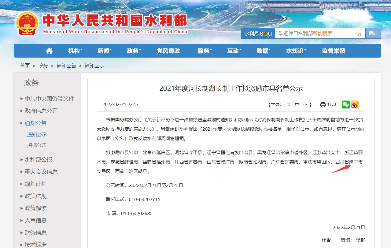 2月22日,记者从水利部官网获悉,近日水利部组织研究提出了2021年度河长制湖长制拟激励市县名单,四川省遂宁市安居区在列,是此次四川唯一入选的区(市、县)。