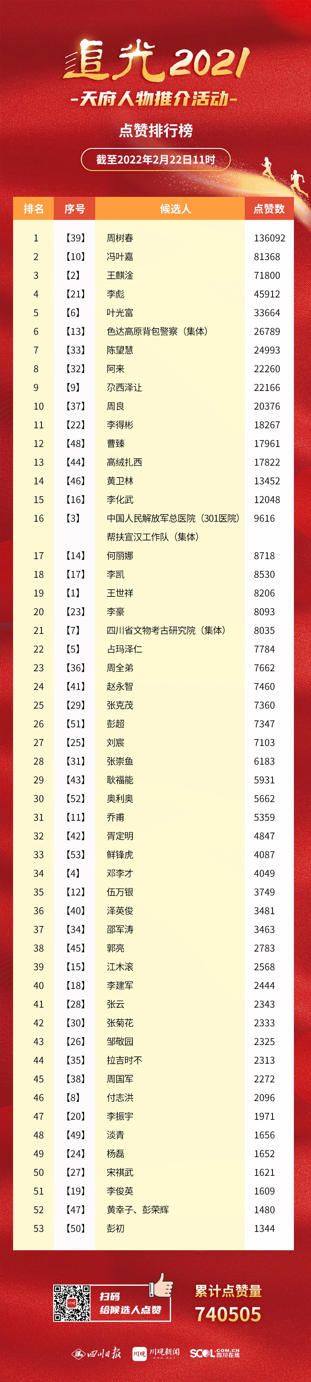 截至2月22日11时,已有740505人次参与追光2021•天府人物推介网络点赞活动