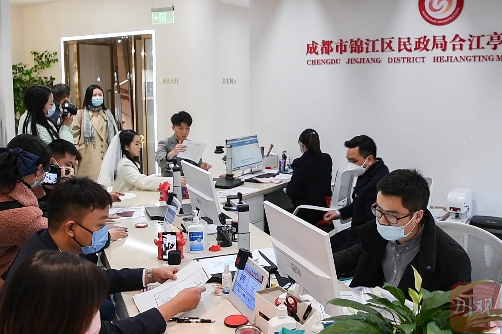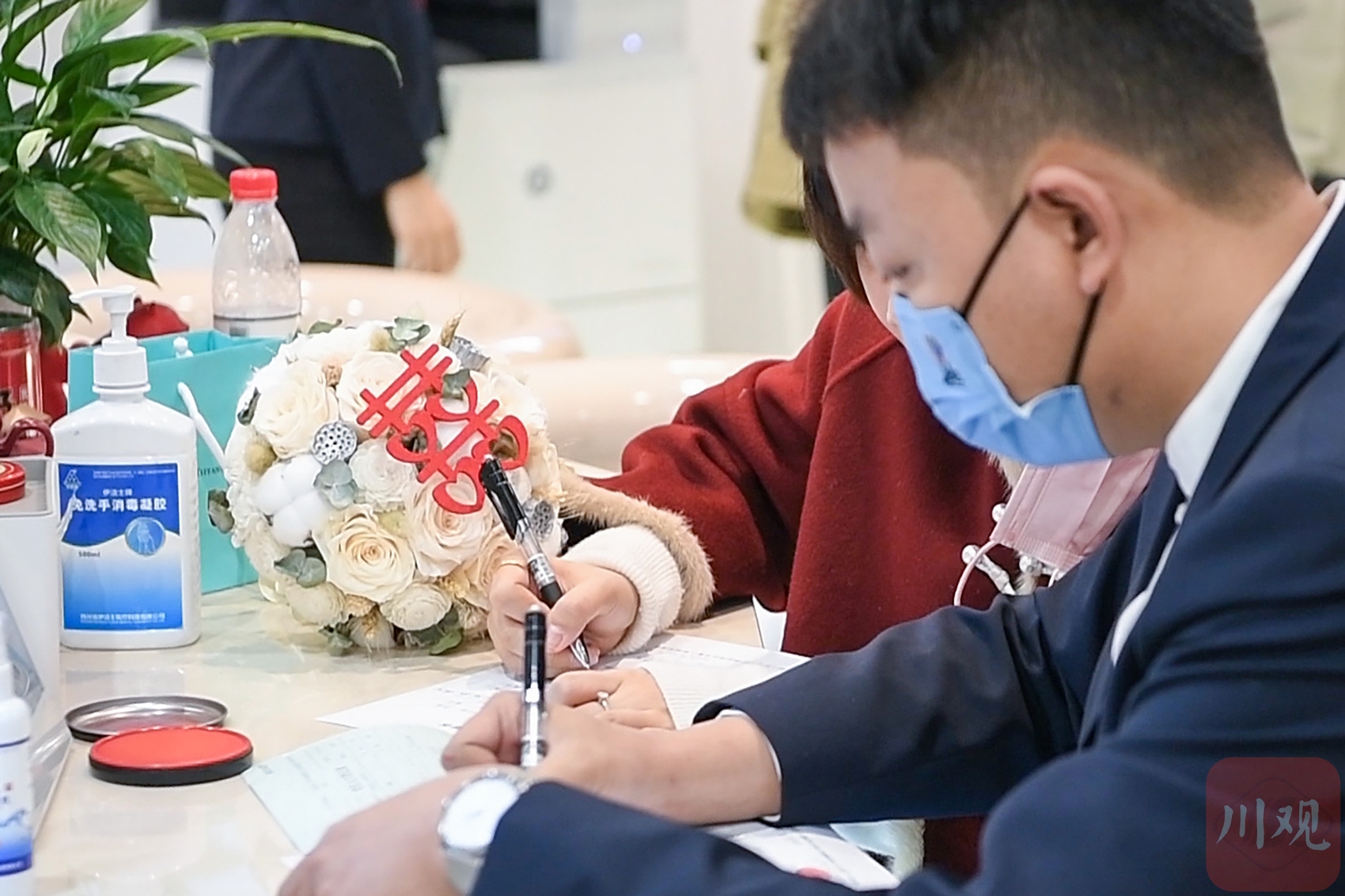 合江亭婚姻登记处工作人员曹彪说,今日作为热门登记日,预计有200余对的新人前来登记,登记处将开展延时服务,加班加点为各位新人们办理。因疫情防控要求,登记处现场进行了测温消毒、分区分流进出等,在安全的前提下,保障甜蜜幸福。