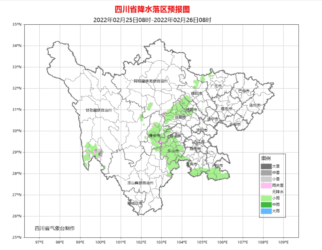 2月25日白天到晚上,雅安乐山2市和成都、德阳、眉山3市西部以及宜宾、泸州2市南部阴天间多云有小雨或零星小雨,盆地其余地方阴天转多云;川西高原和攀西地区以晴间多云天气为主。