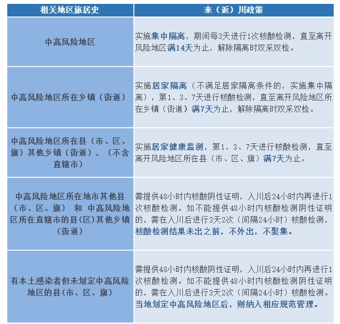 近14天内有中高风险地区和涉疫城市旅居史的来(返)川人员,以及与病例轨迹重合的人员,应尽快向所在社区、村等主动报备,做好个人防护,就近完成核酸检测。