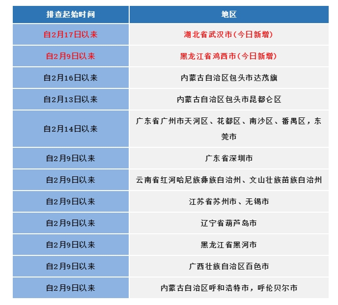 如果您近期有以下地区的旅居史,请第一时间向村(社区)、单位或入住酒店报备,配合做好各项疫情防控工作。