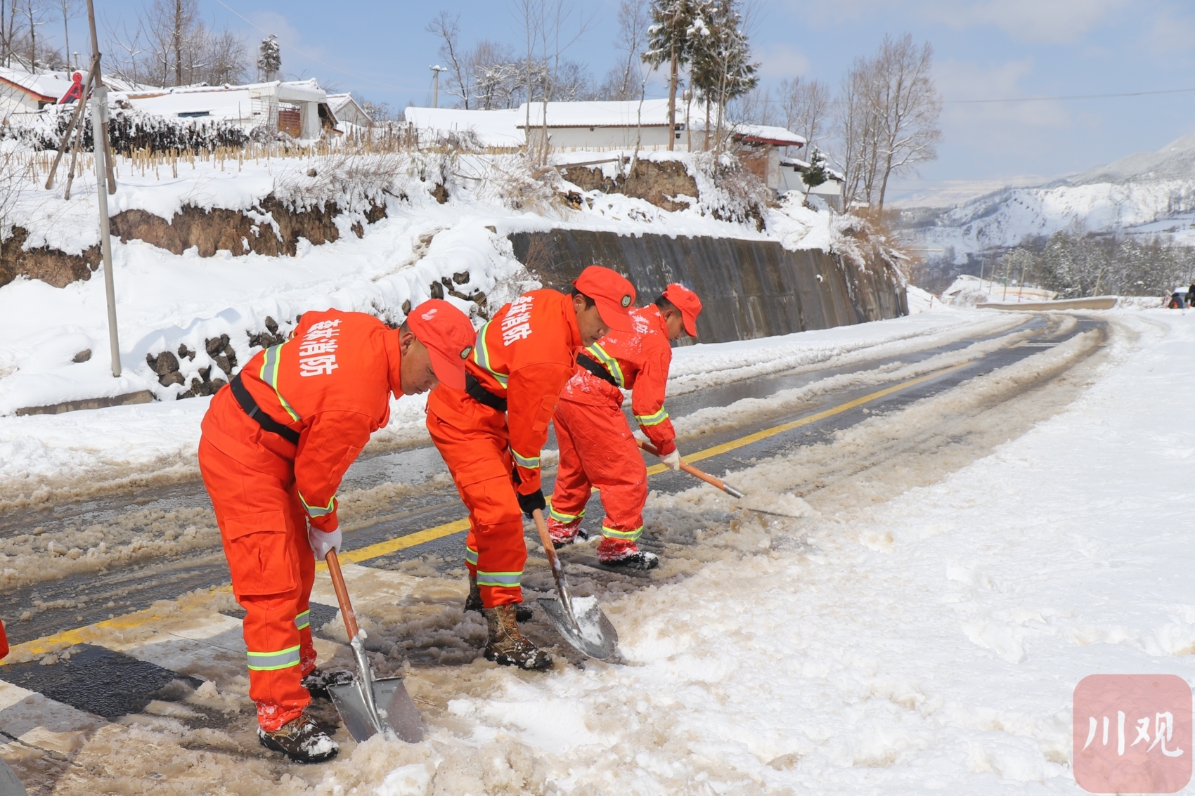 在清雪除冰现场,队员们在结冰路段铲雪除冰,帮助滞留车辆通行,全力保障人民群众的通行安全。