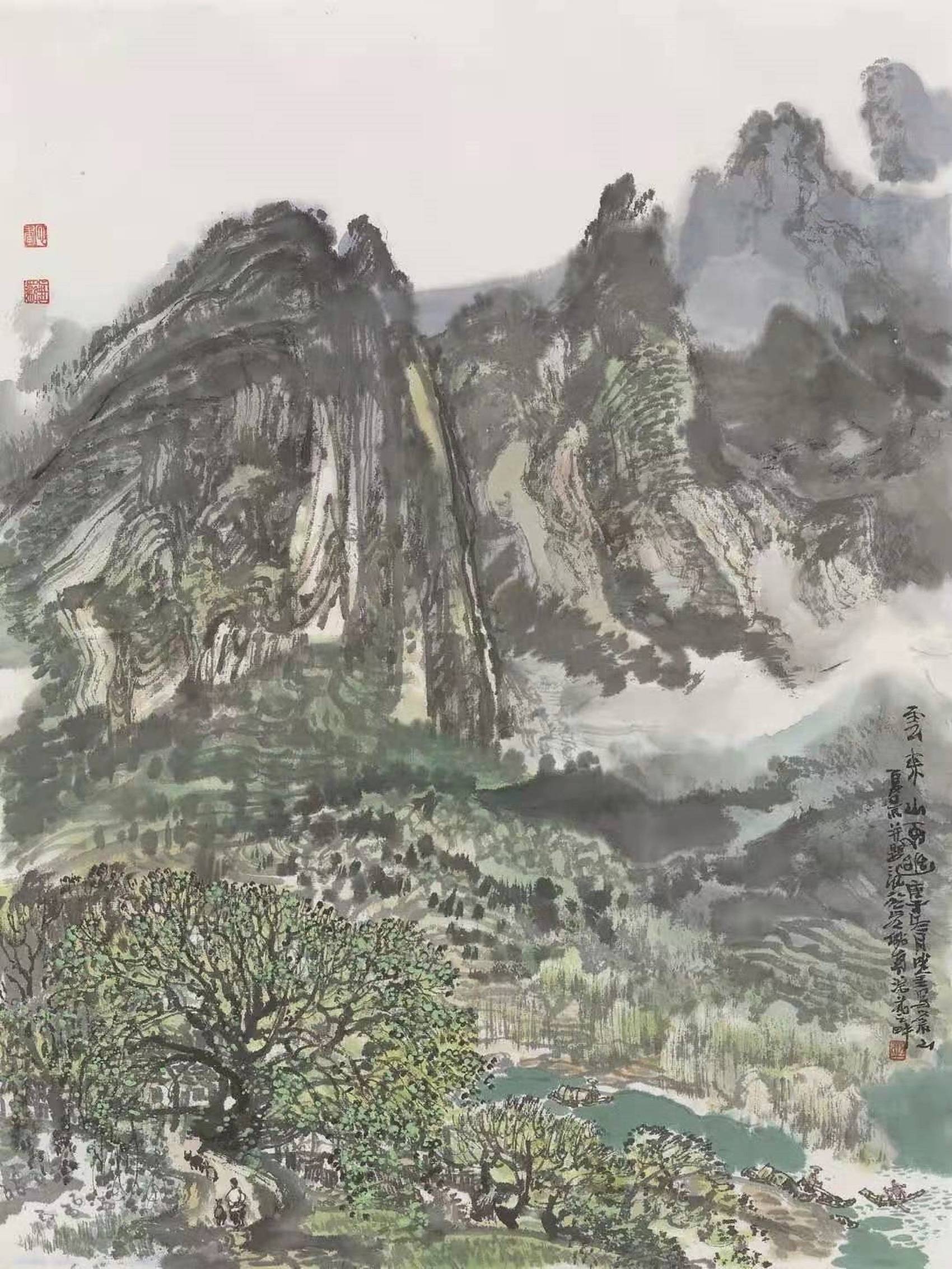 因油画功底深厚,巫成金擅于将油画中焦点聚光和空间延展的手法运用到中国画中,使得作品总呈现出鲜明的层次感和纵深感。《云来山更幽》,他就将人的眼光从眼前的繁树,一直带到远处的云山。几何化分布的构图和色彩的块面化处理,让作品大方、开阔。最妙的是远山的晕染,在泼墨挥毫间,生出一种出其不意的潇洒意象,让人体味“似与不似之间最妙”的美韵。白云缥缈,碧水荡漾,画家捕捉着自然的天籁,让意趣穿越千山万水,直抵人心。