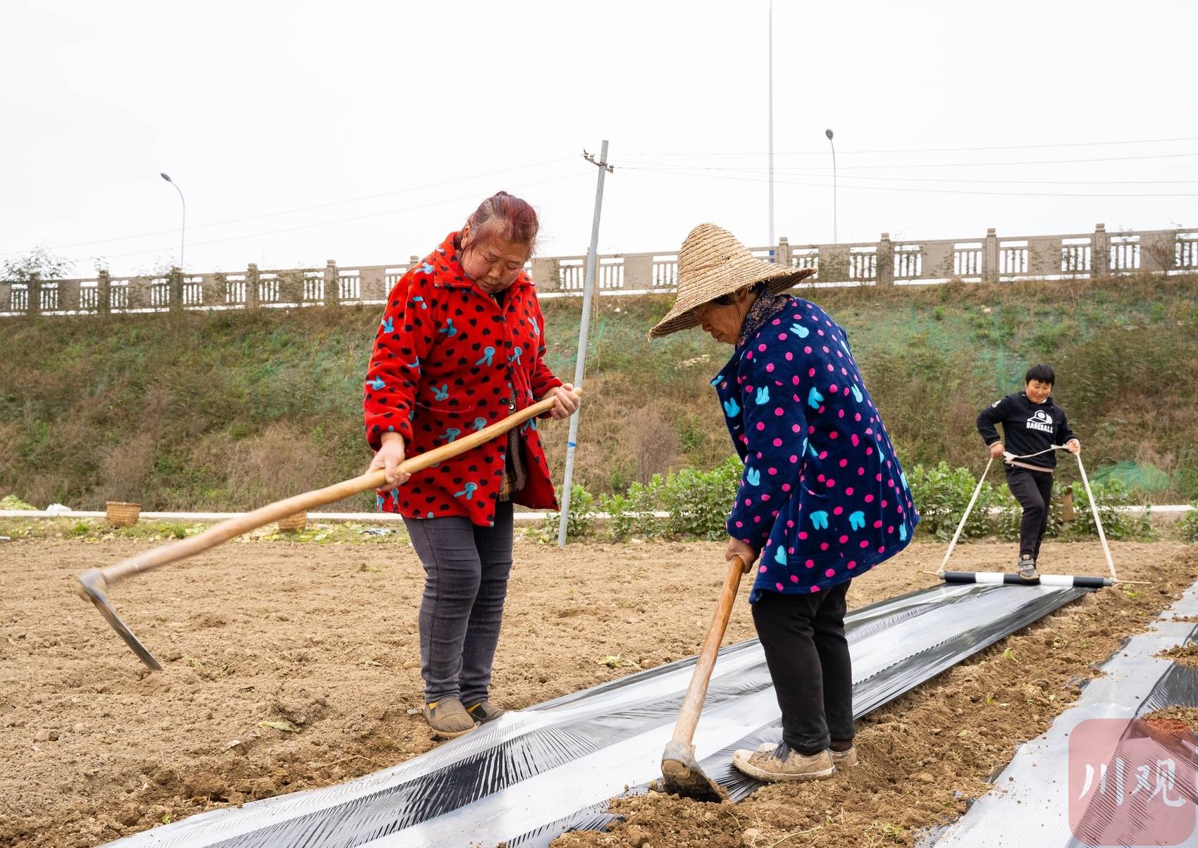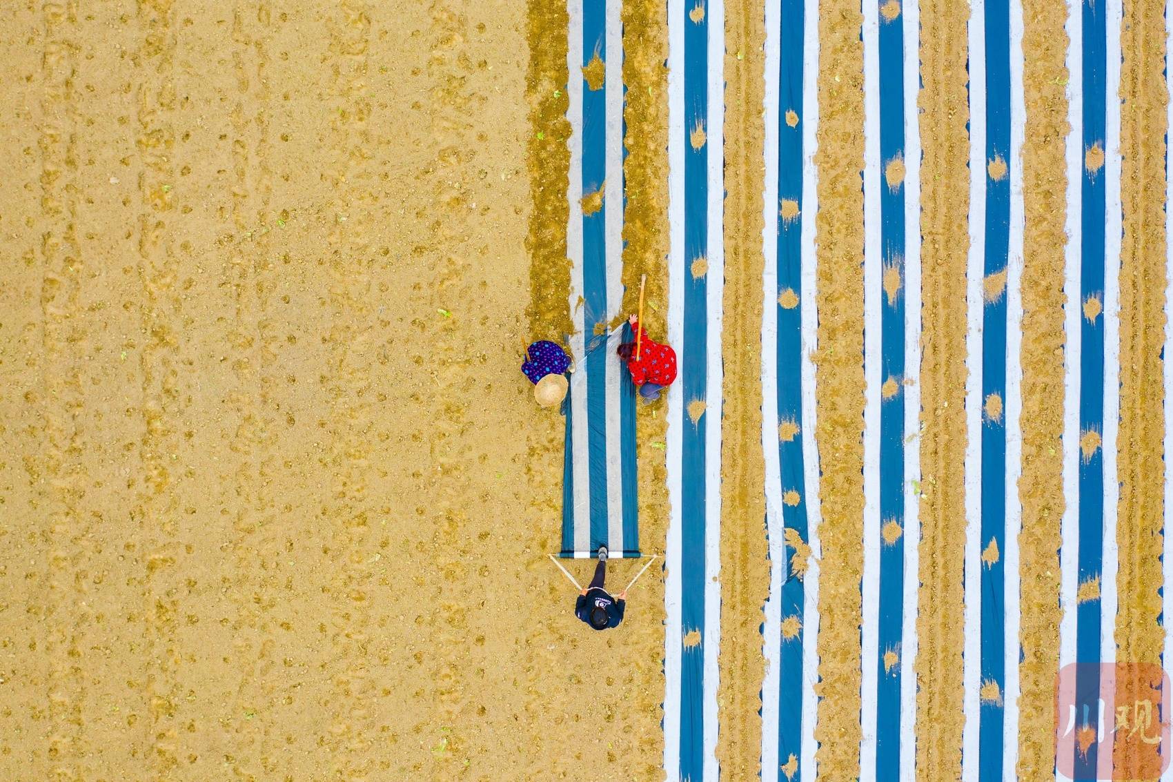 人勤春来早,乡间涌春潮。2月24日,遂宁市船山区老池镇,村民正驾驶机器翻耕土地。对面田地里,几位村民熟练地为刚种下的青荚肉豆覆膜。在他们身后的温室大棚,种下不久的蔬菜已长出嫩苗。