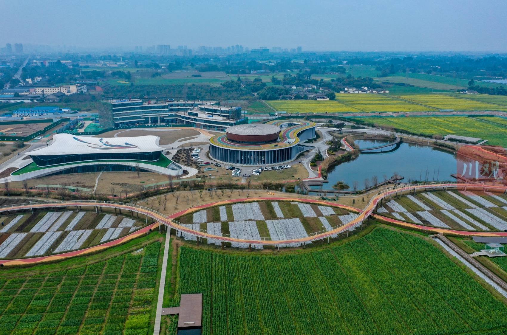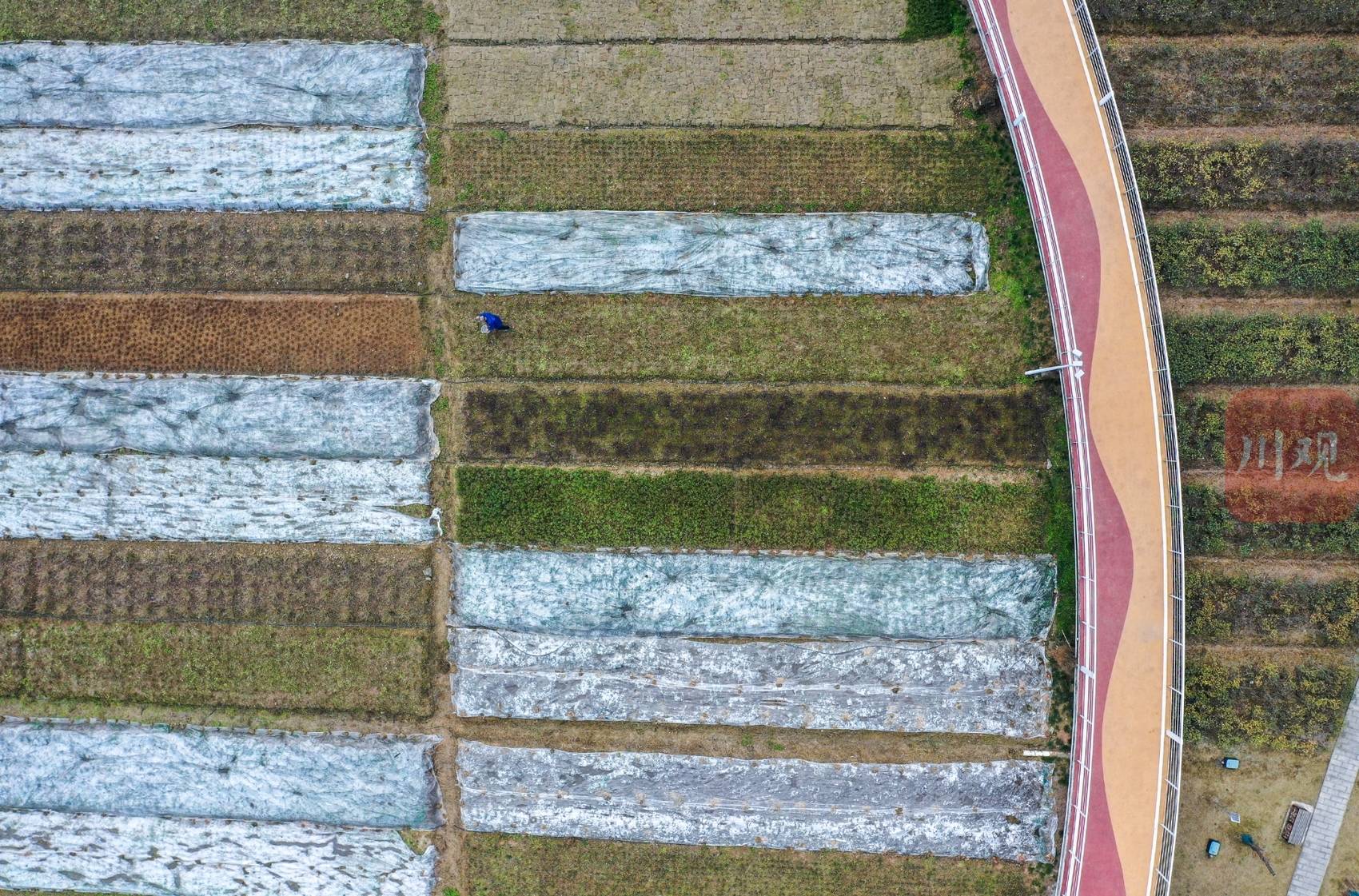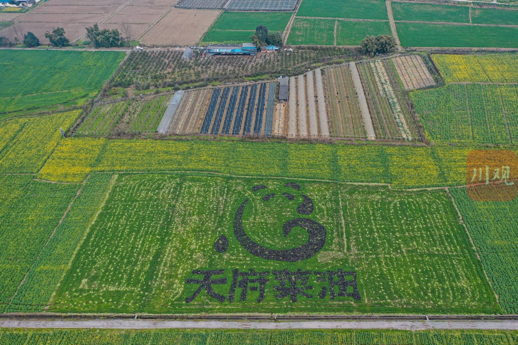 2月26日,成都邛崃市天府现代种业园区内,被整齐划分的农田中,油菜花地已经显现金黄色,开始进入盛花期,而小麦地里一片翠绿。从空中俯瞰,园区阡陌纵横,内种植的作物被整齐的划分成方块,其中有油菜、小麦等新品种在这里栽种。