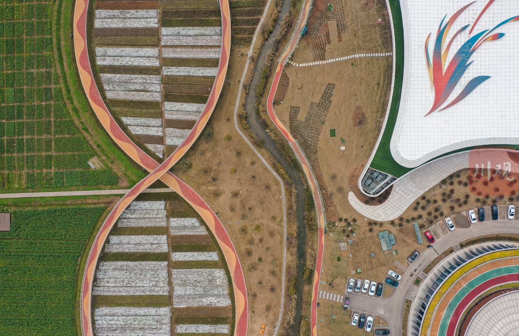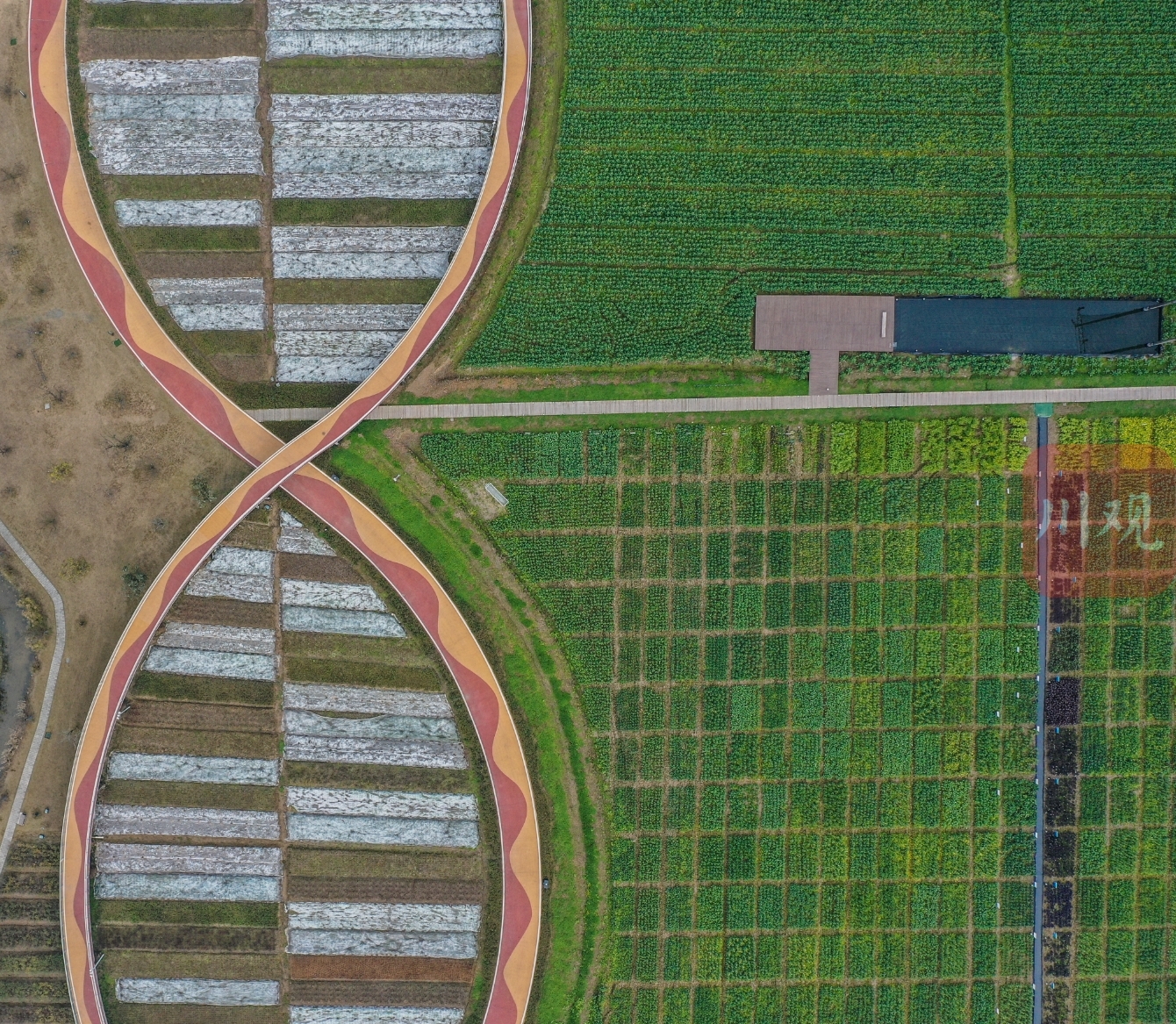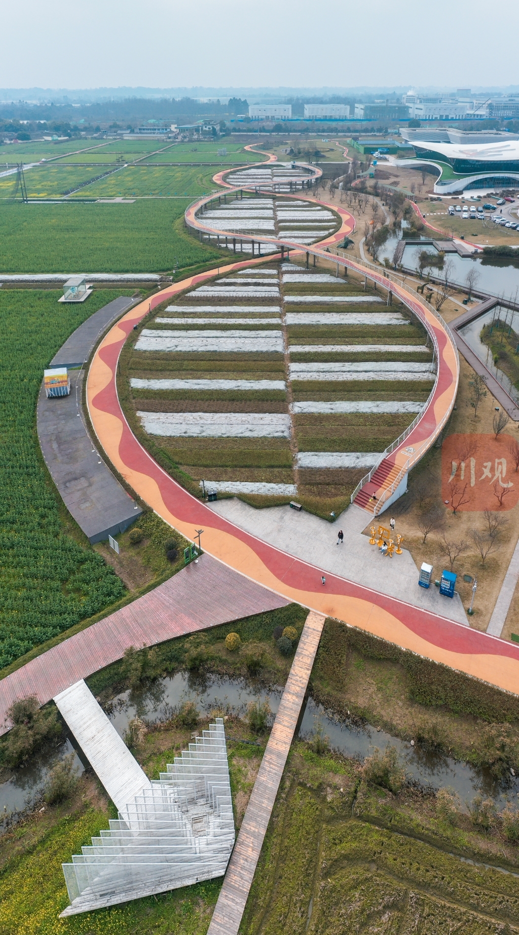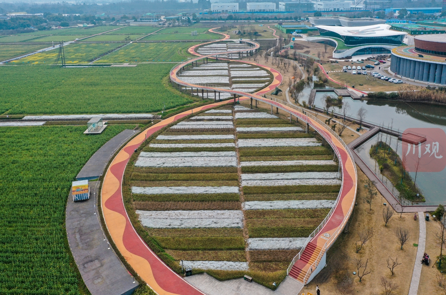 2月26日,成都邛崃市天府现代种业园区内,被整齐划分的农田中,油菜花地已经显现金黄色,开始进入盛花期,而小麦地里一片翠绿。从空中俯瞰,园区阡陌纵横,内种植的作物被整齐的划分成方块,其中有油菜、小麦等新品种在这里栽种。