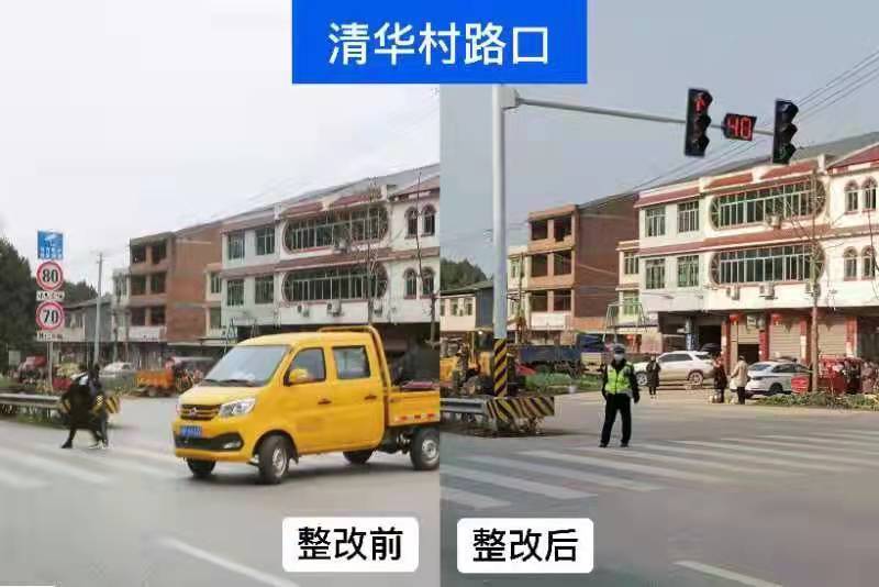 国道108线梓潼段清华村路口,此前因为缺少红绿灯导致事故多发,在舆论监督曝光该问题后,该路口及时加装了红绿灯,图为该路口前后对比。图片由绵阳市委宣传部提供