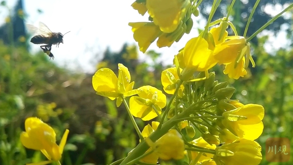 近日,春日中的广安市双碑村菜花盛开,蜜蜂在花间飞舞,田间地头里一片生机勃勃。