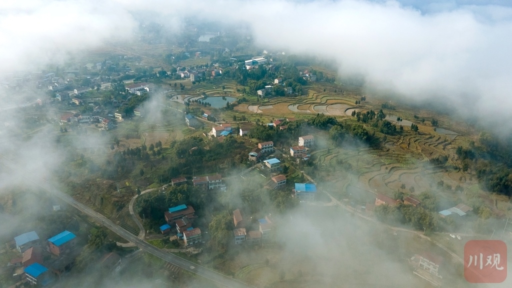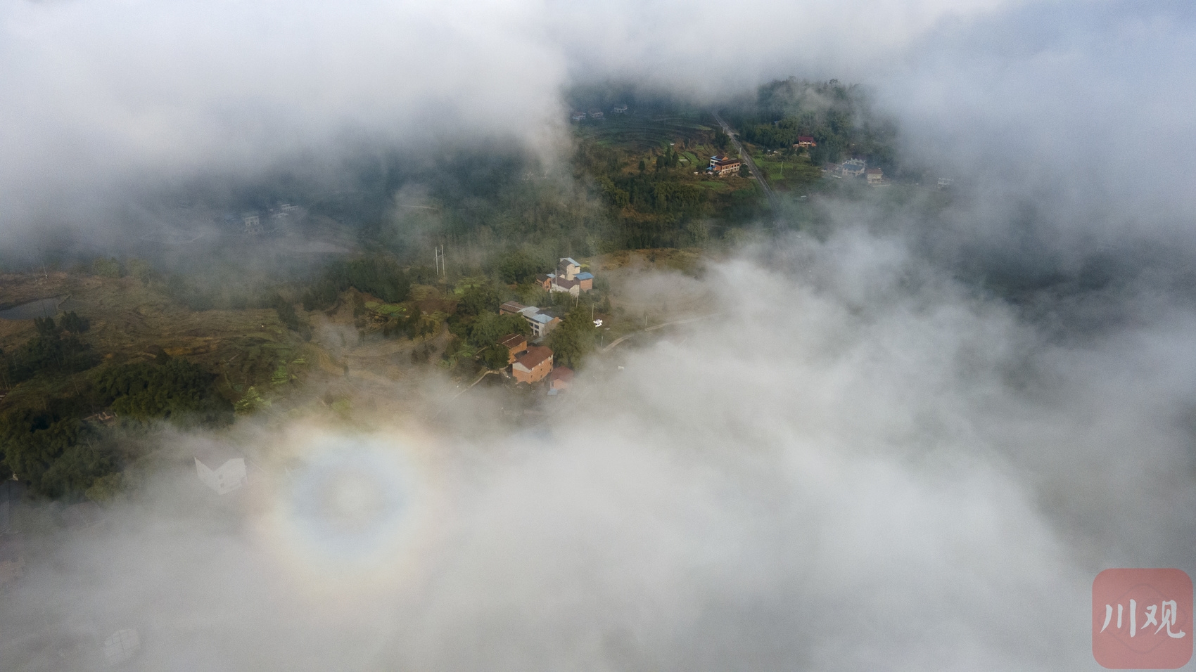 流云在双碑村上空涌动,一轮佛光在云中显现,与村中沃野相映成趣。
