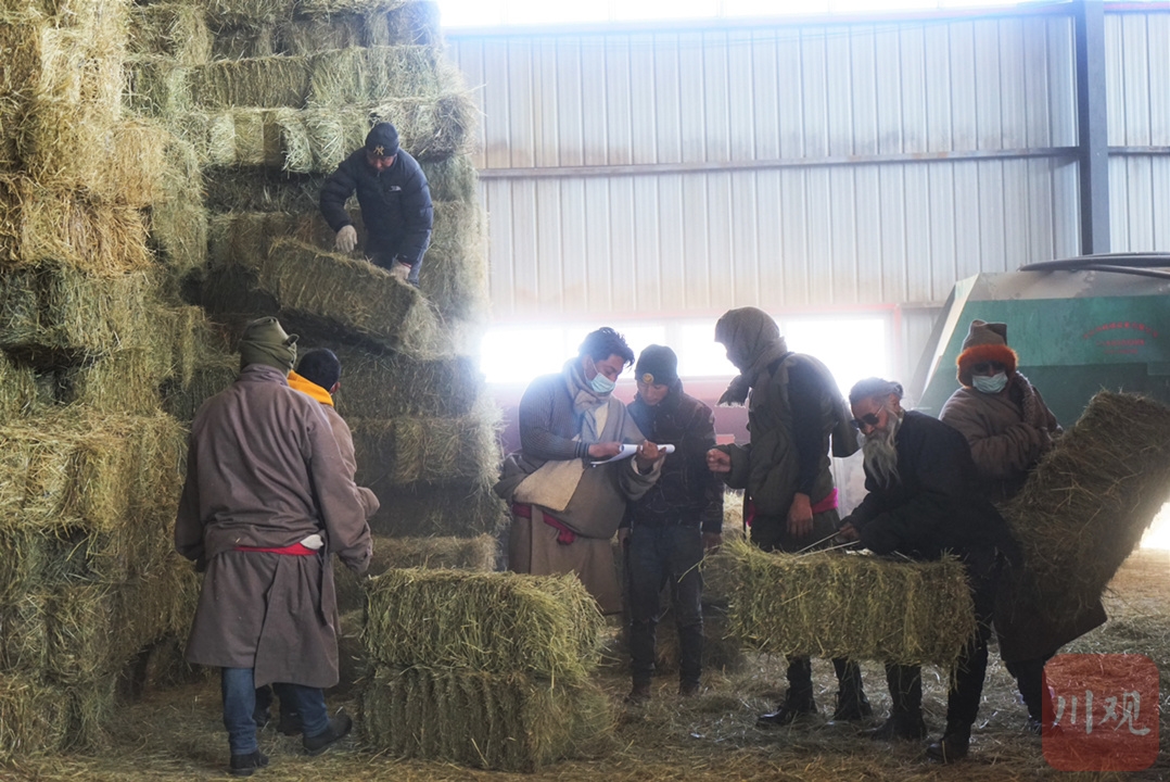 2月27日,在阿坝州红原县瓦切镇牧草产业园,前来领取饲草料的牧民群众在工作队和村干部的帮助下,正忙着登记、装车、拉运,每个人的脸上都洋溢着幸福的笑容,现场一片繁忙景象。