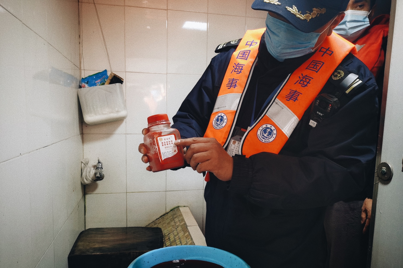 “第一步是检查船舶的生活污水是否直排长江。”执法人员崔浩庆向船长提出要求,很快,一行人来到了位于甲板二层的厕所。只见崔浩庆接起一盆清水,往里倒入红色的食用色素,随后,将搅拌均匀的红色液体倒入厕所。