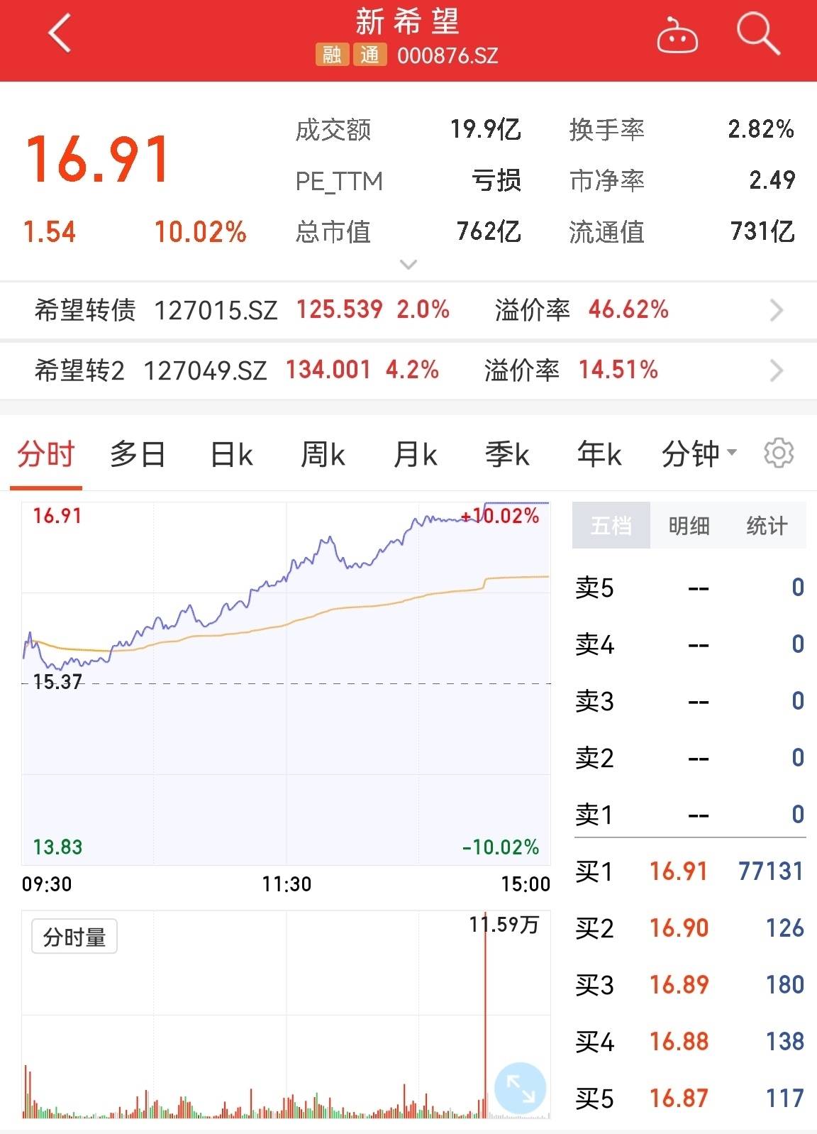 随着猪肉概念和预制菜概念的集体走强,新希望、巨星农牧等多只川股收获涨停板。截至收盘,新希望报16.91元,巨星农牧报24.30元。
