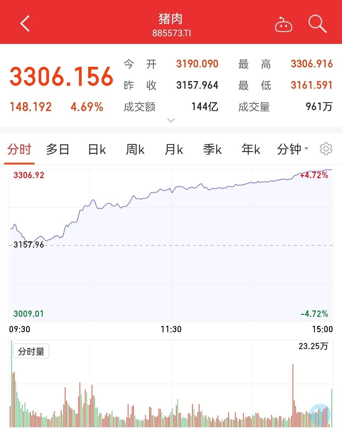 3月1日,猪肉概念全天强势上涨4.69%。与猪肉概念相关的大消费板块也趁势而上,今年以来不断出圈的预制菜概念股也大涨,截至收盘,预制菜概念板块涨幅2.28%。