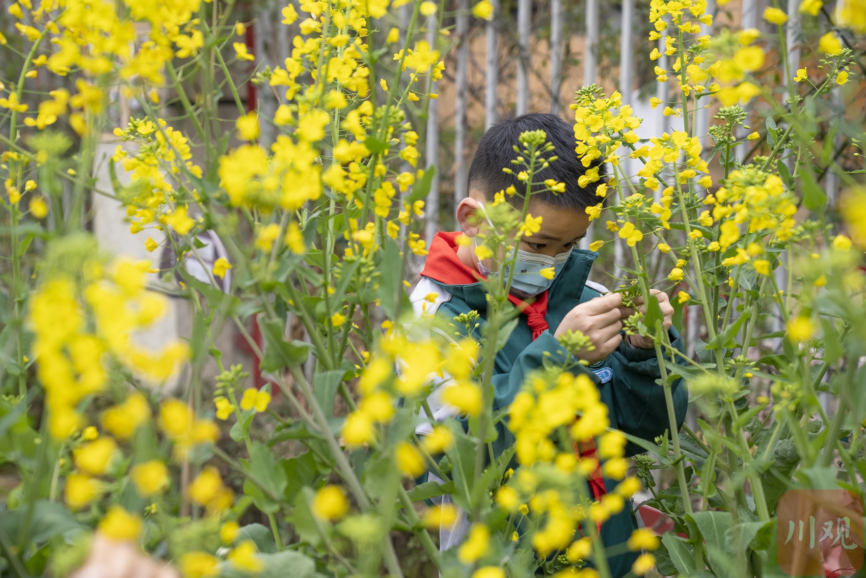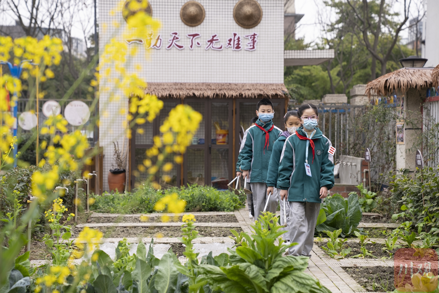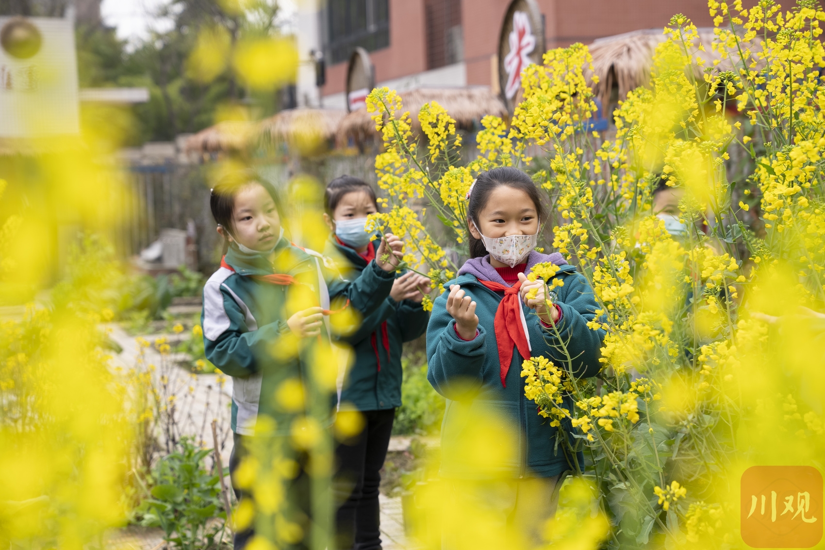 3月2日,记者在成都市温江区鹏程小学校园里看到,一片金黄色的油菜花正盛开在操场边上。“这片油菜花是去年十月份带领三年级的孩子们种下的,当时是结合学校的一个节气课程,成都的春天,金黄色的油菜花漫山遍野”,2019级1班班主任韩美玲告诉记者,在学校的这片土地上,不光是种植油菜,此前还收获了白萝卜,大白菜等,如今地里也种植着其它农作物。她表示,这是想带领孩子们在这个校园里面一起经历生命的美好,一起种下一片春天。