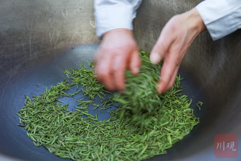 蒙顶甘露是蒙顶山茶的主推品类。雅安市名山区茶产业推进小组办公室副主任罗江介绍,甘露采摘早春一芽一叶初展原料,经过摊晾和“三炒三揉”制作而成,茶叶色泽嫩绿、油润,闻之清香、入口甘甜。