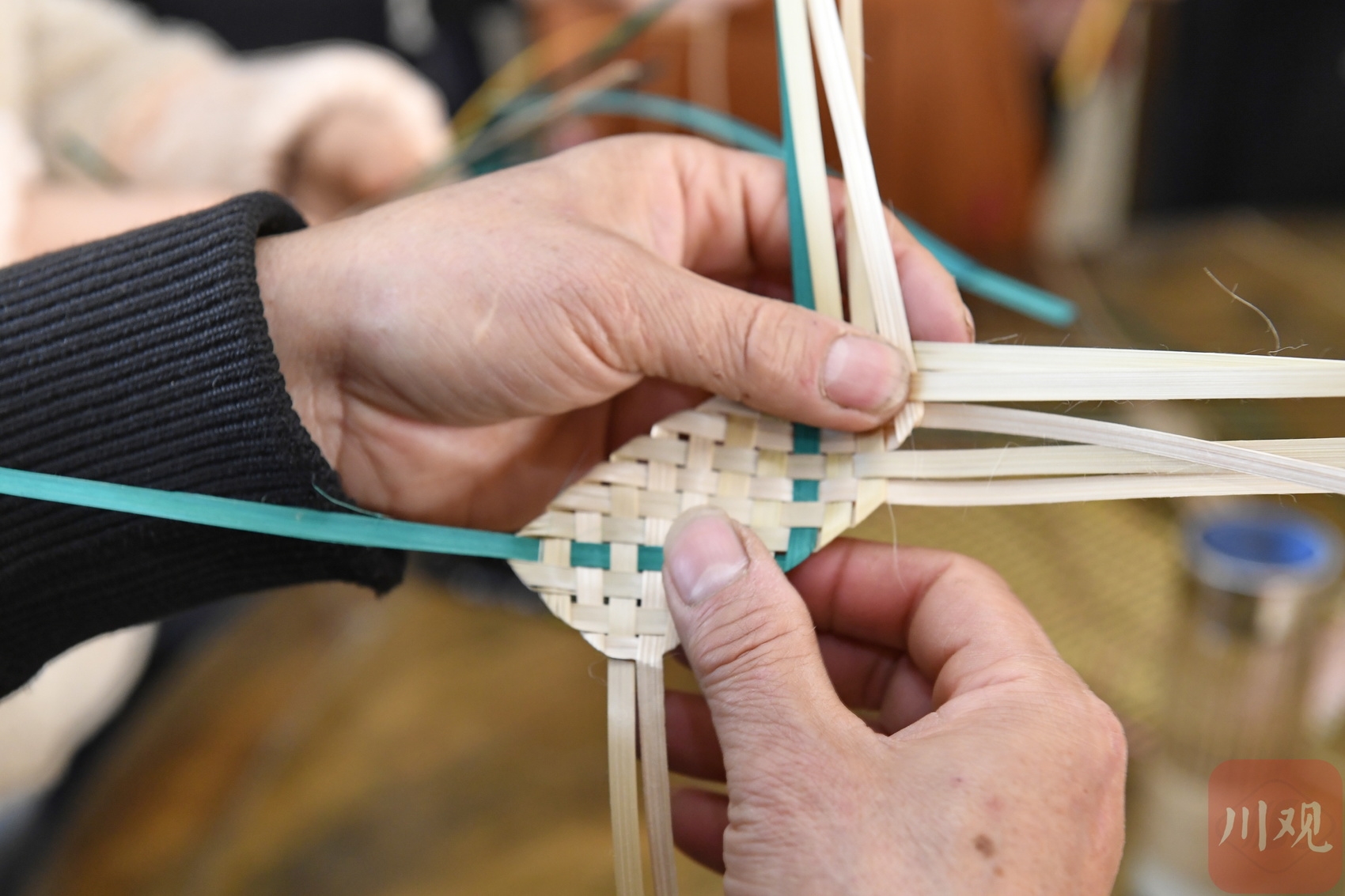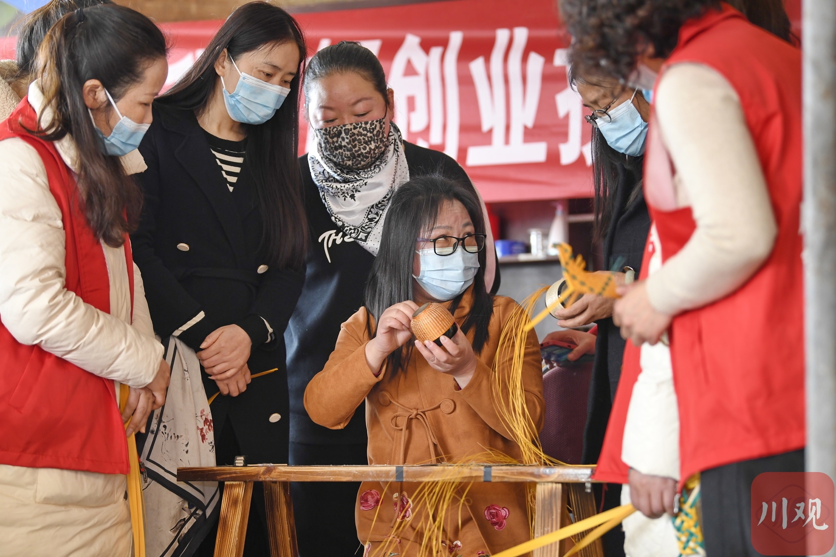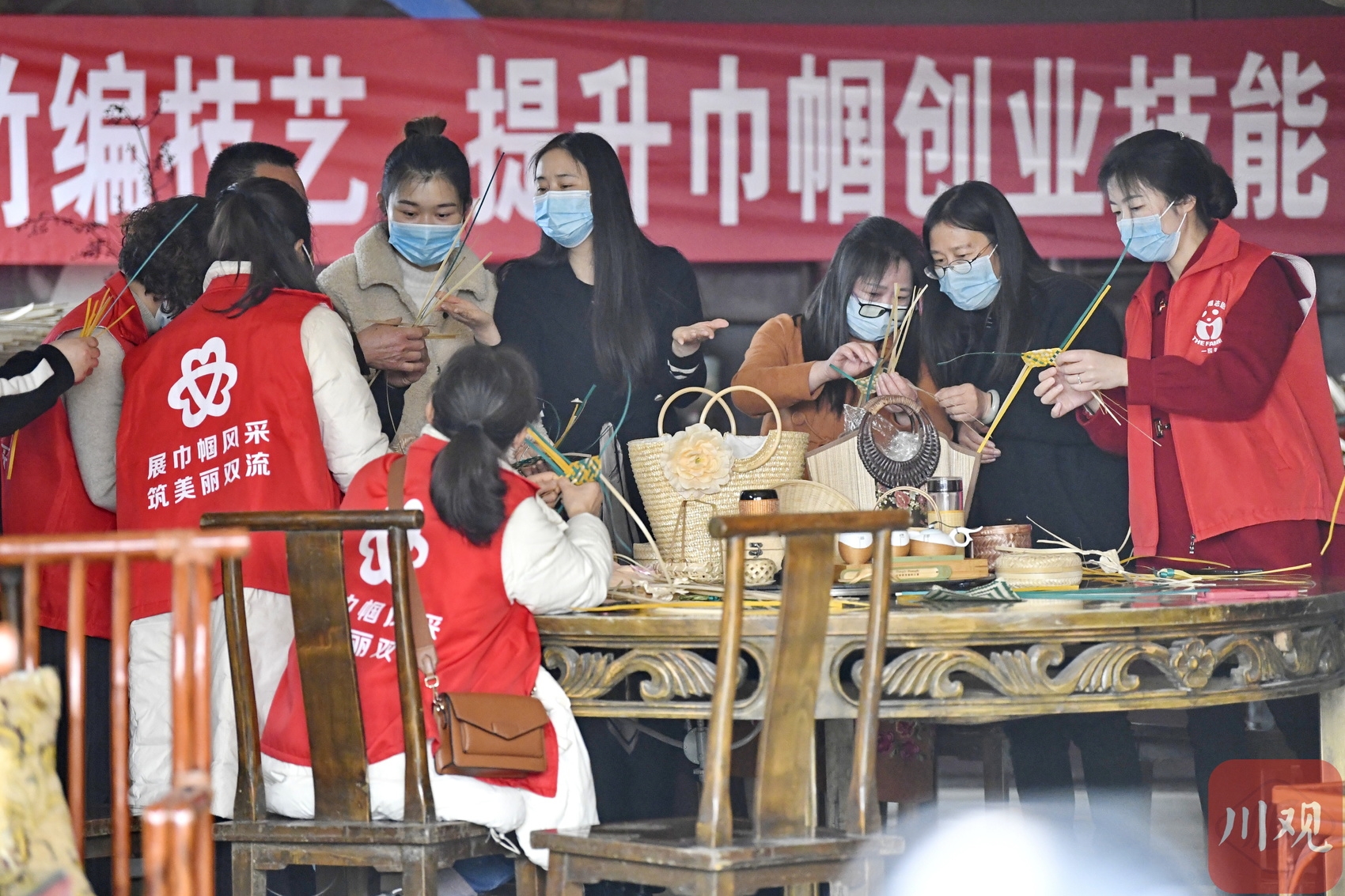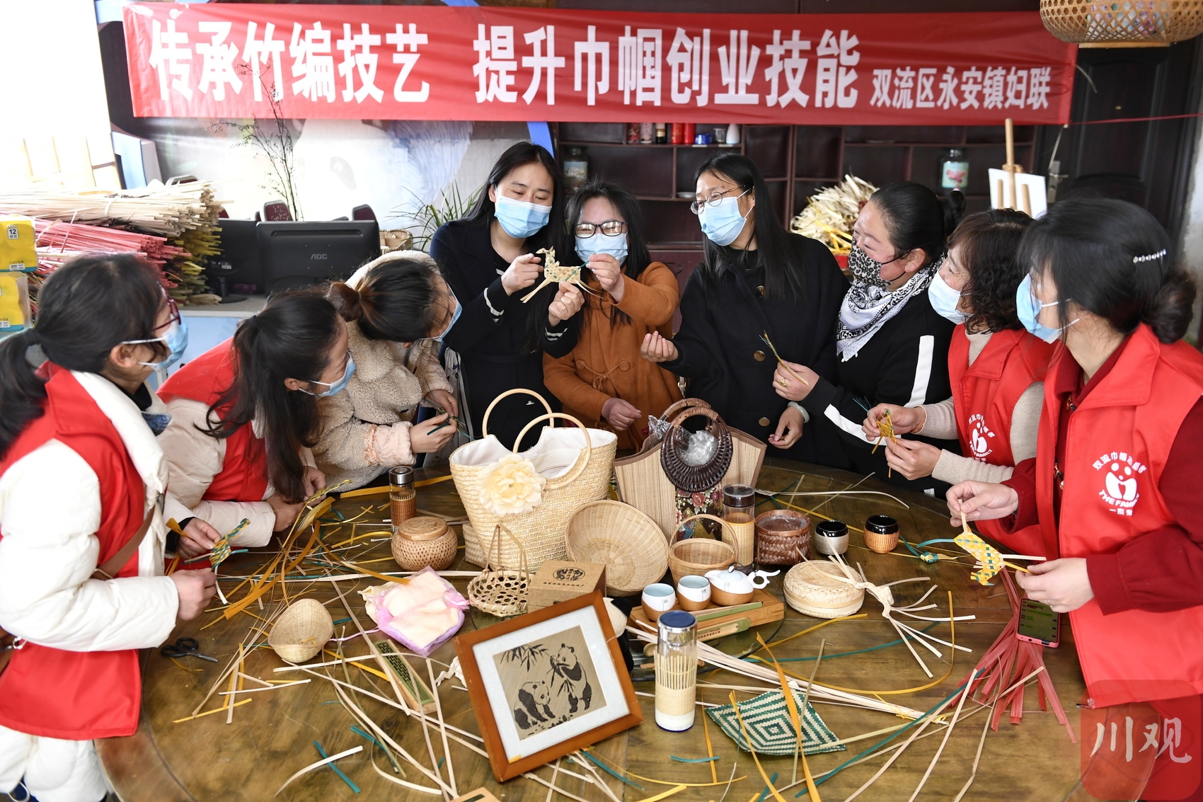 3月3日,成都市双流区永安镇双坝村非遗竹编培训基地,当地妇女在非遗传承人的带领下学习竹编技艺。