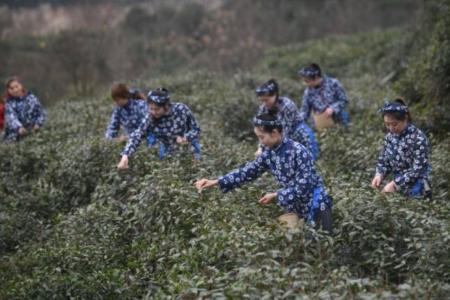 3月3日,经过一个冬天的休养生息,沐浴着春日的阳光,茶树早已孕育出饱满鲜嫩的茶芽。采茶姑娘们一双双巧手在茶尖飞舞,或捏、或提、或掐,将一颗颗嫩绿的茶芽收入茶兜。