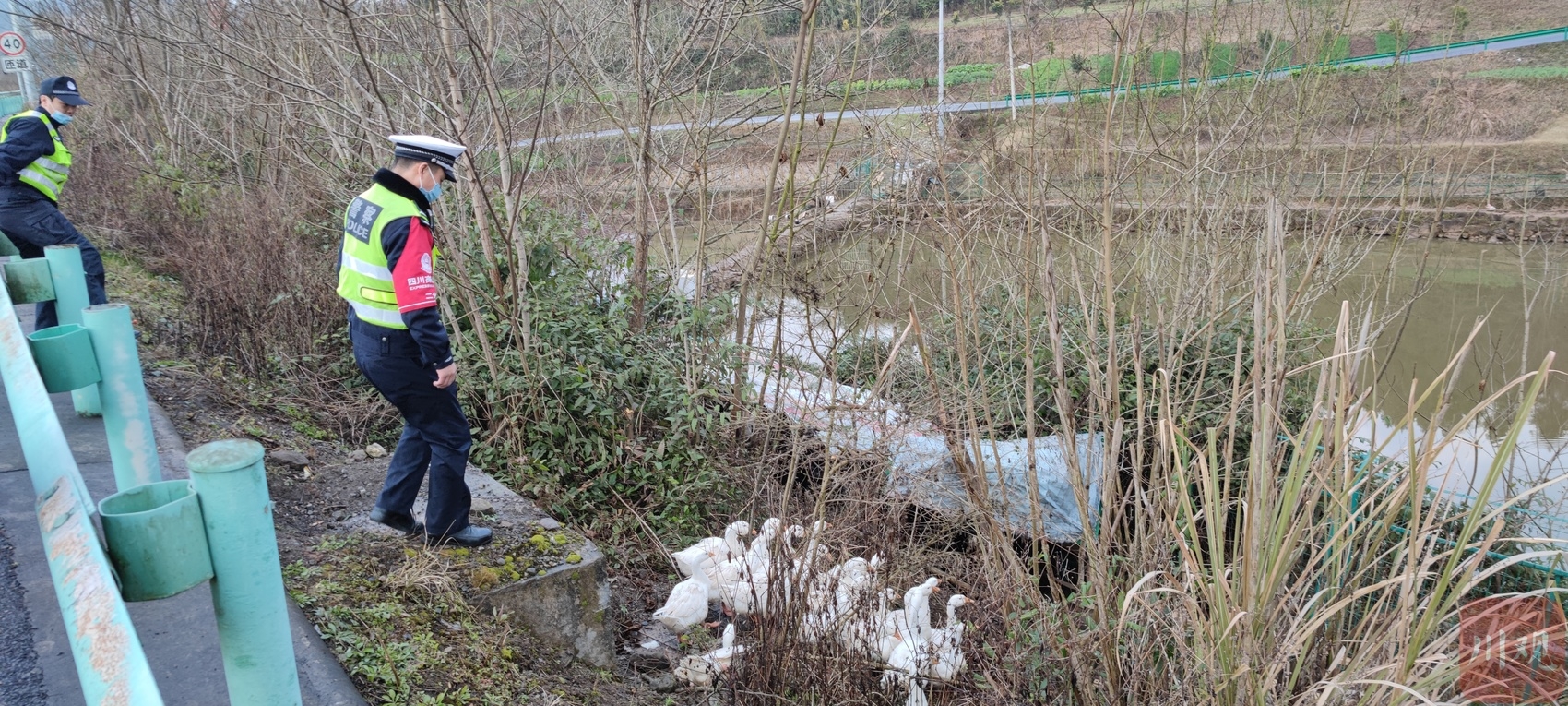 3月2日下午6时许,四川高速公安二分局八大队接到报警称,在巴中市S2成巴高速观音庵收费站附近有一群大鹅在高速上大摇大摆的散步!民警随即赶往现场,果然发现大约有20只大鹅在高速上“招摇撞市”,来往车辆纷纷紧急避让,情况十分危险。于是,大队民辅警变身“鹅倌”,使出浑身解数将其赶下高速!