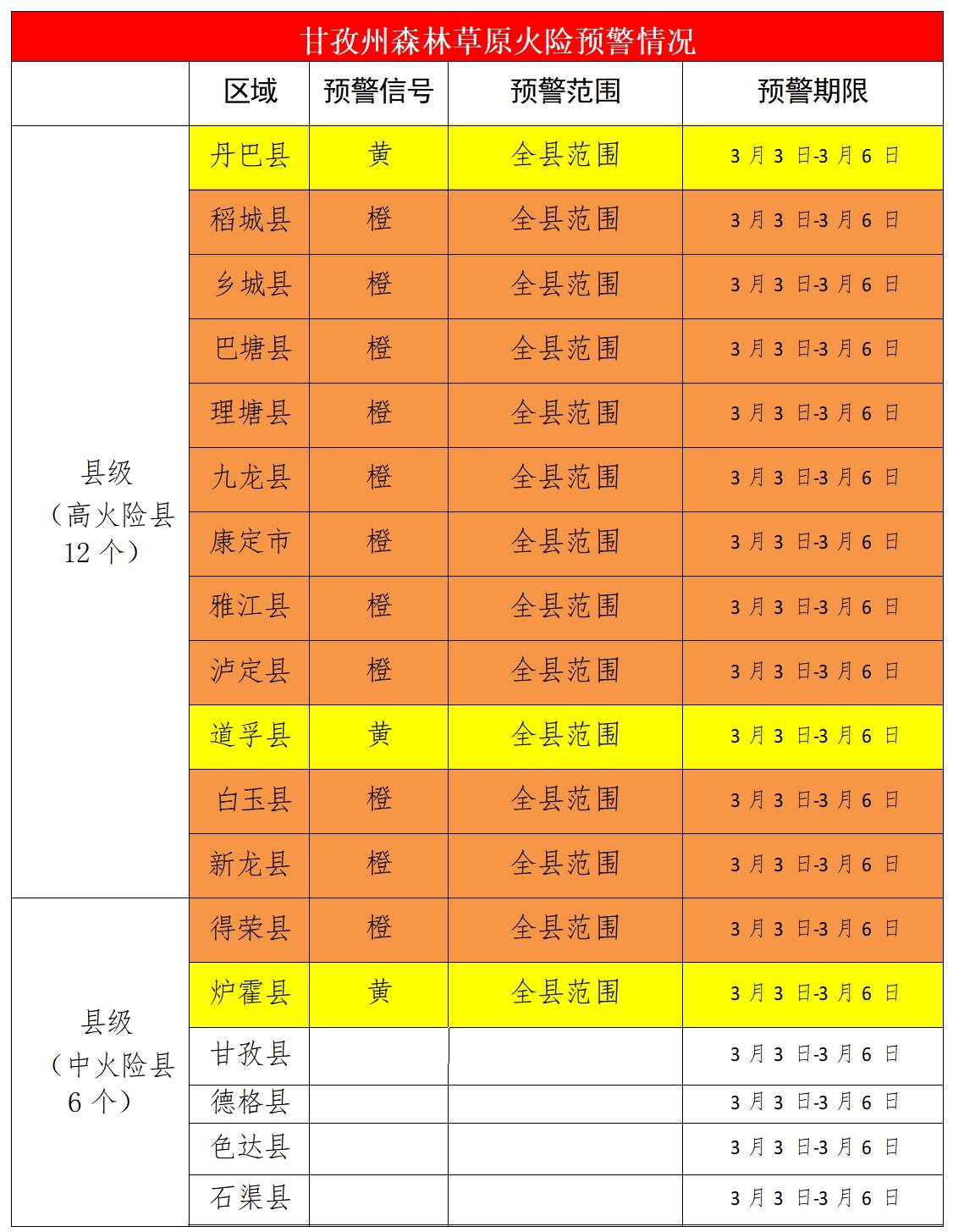 经州森防指办公室、州林草局、州应急管理局、州气象局会商,综合研判气象条件、林区物候、野外火源及火灾发生情况,预计3月3日至8日,康定市、泸定县、九龙县、雅江县、新龙县、白玉县、巴塘县、理塘县、乡城县、稻城县、得荣县森林草原火险等级将维持在高度危险级别,防火形势十分严峻,特发布高森林草原火险橙色预警。丹巴、炉霍、道孚县发布高森林草原火险黄色预警。