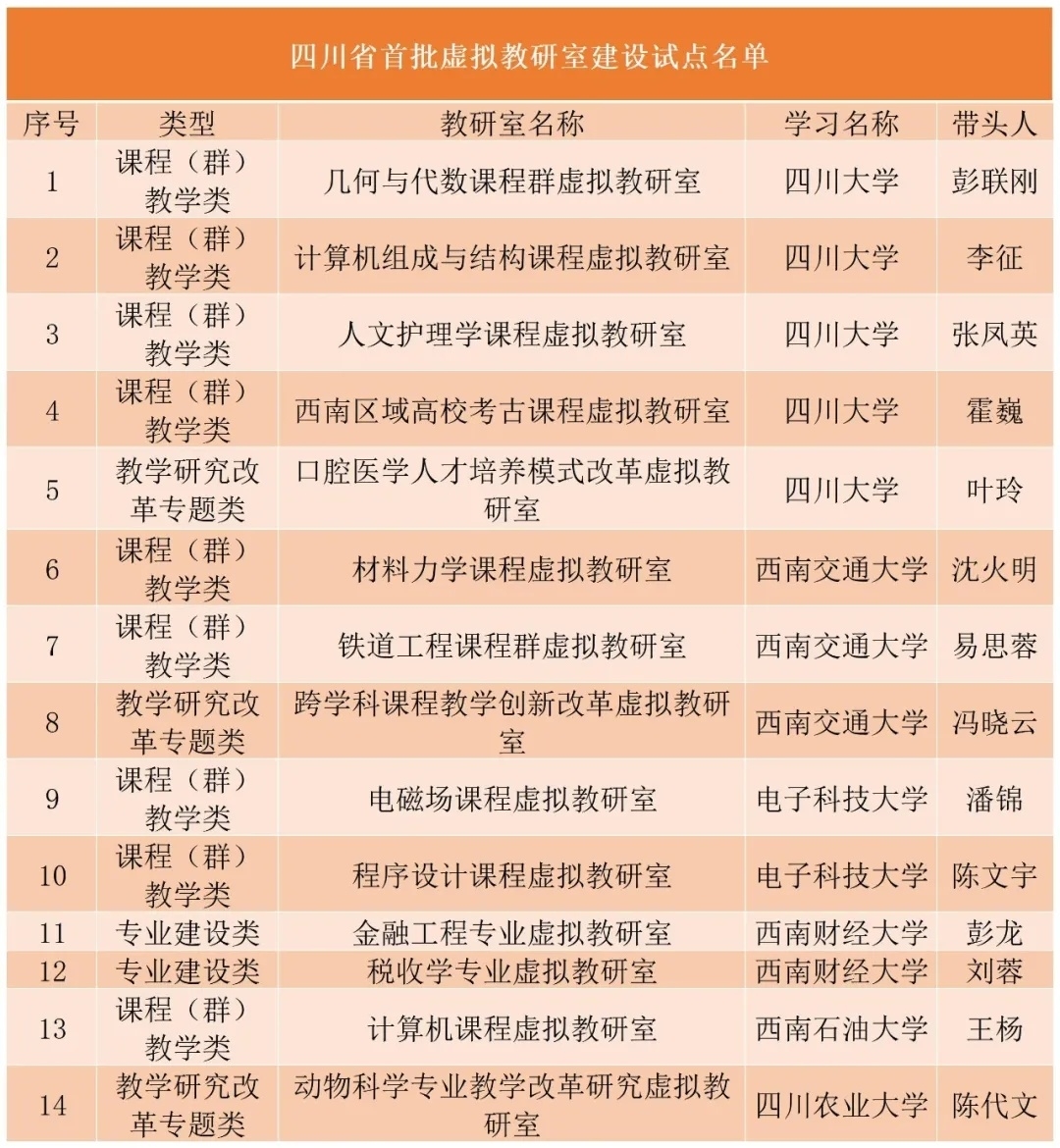 四川省共有14个虚拟教研室建设试点,其中四川大学5个,西南交通大学3个,电子科技大学、西南财经大学各2个,西南石油大学和四川农业大学各1个项目入选。详见名单: