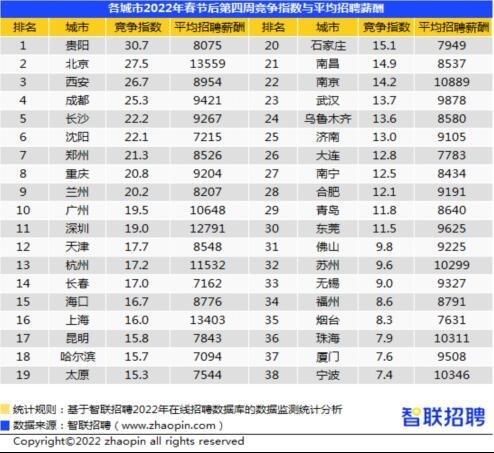 节后第四周,成都地区的竞争热度依然高,排名第四。薪酬方面,平均招聘薪酬9421元。其中,第四周高薪榜单中,中介服务的薪酬增幅较大,较上周增长约8%,排名由第三周的第15位提升至第7位,平均招聘薪酬为10364元/月。此外,互联网、金融等行业的薪资水平也较高,平均招聘薪酬变化较小。