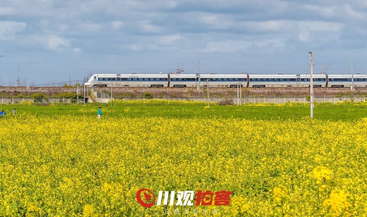 成都双流区黄水镇,一抹抹金黄嵌在油菜花海里,一串串花团锦簇的金黄,盛开朵朵生命的绚美,一列列开往春的列车穿梭其中,宛如动态的画卷。